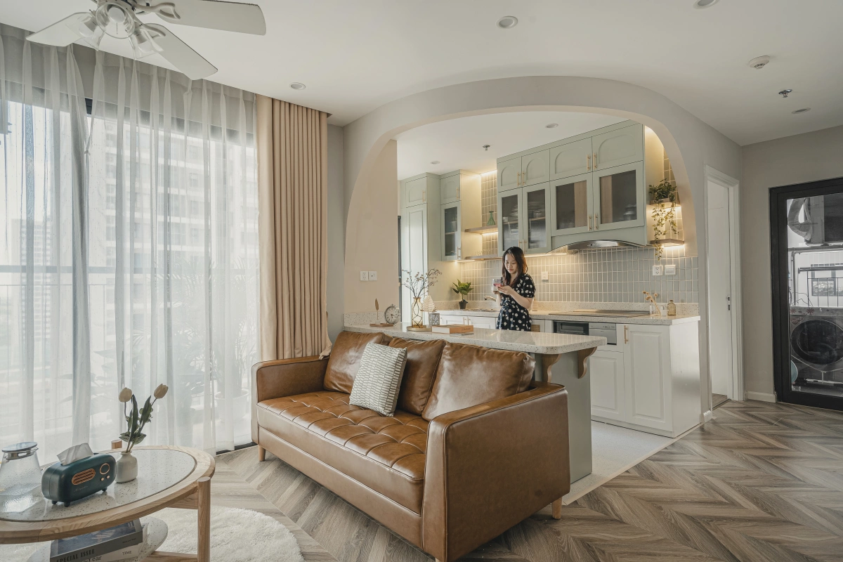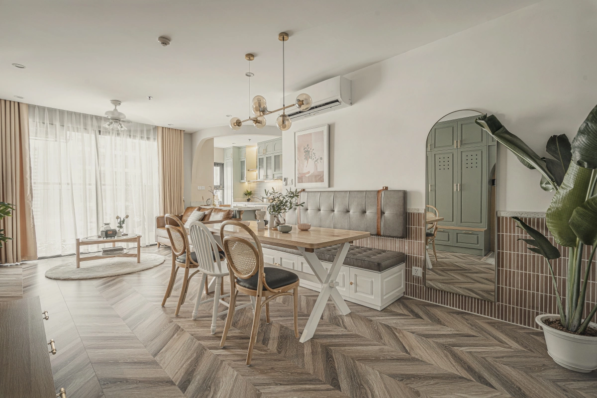 Căn hộ nổi bật với màu sắc trầm, nhã nhặn, kết hợp giữa tone trắng và gỗ tự nhiên.
