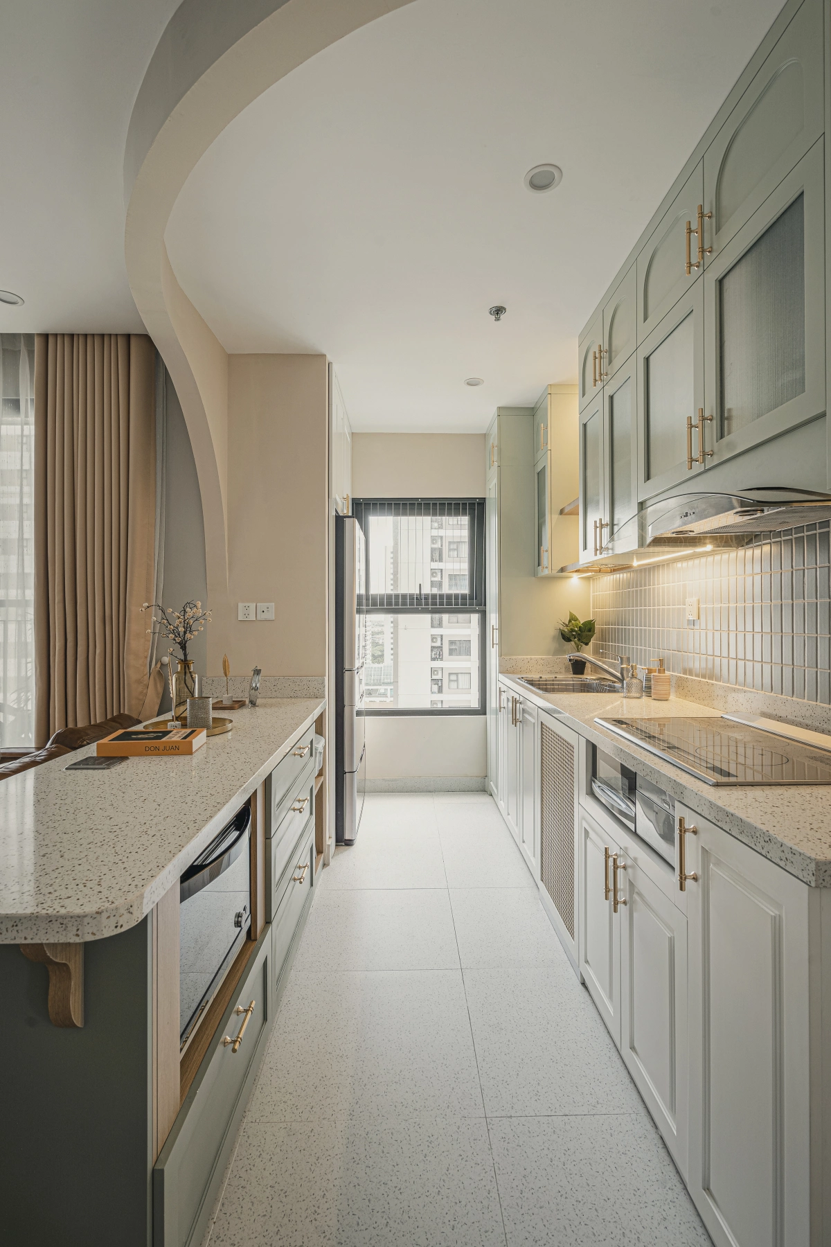 Khu bếp được ngăn cách với khu tiếp khách bởi sự khác biệt trong hệ sàn gỗ và gạch. Khu bếp nằm liền kề với ban công. Đảo bếp tích hợp bồn rửa và hệ tủ đựng đồ, giúp tối ưu không gian sử dụng.