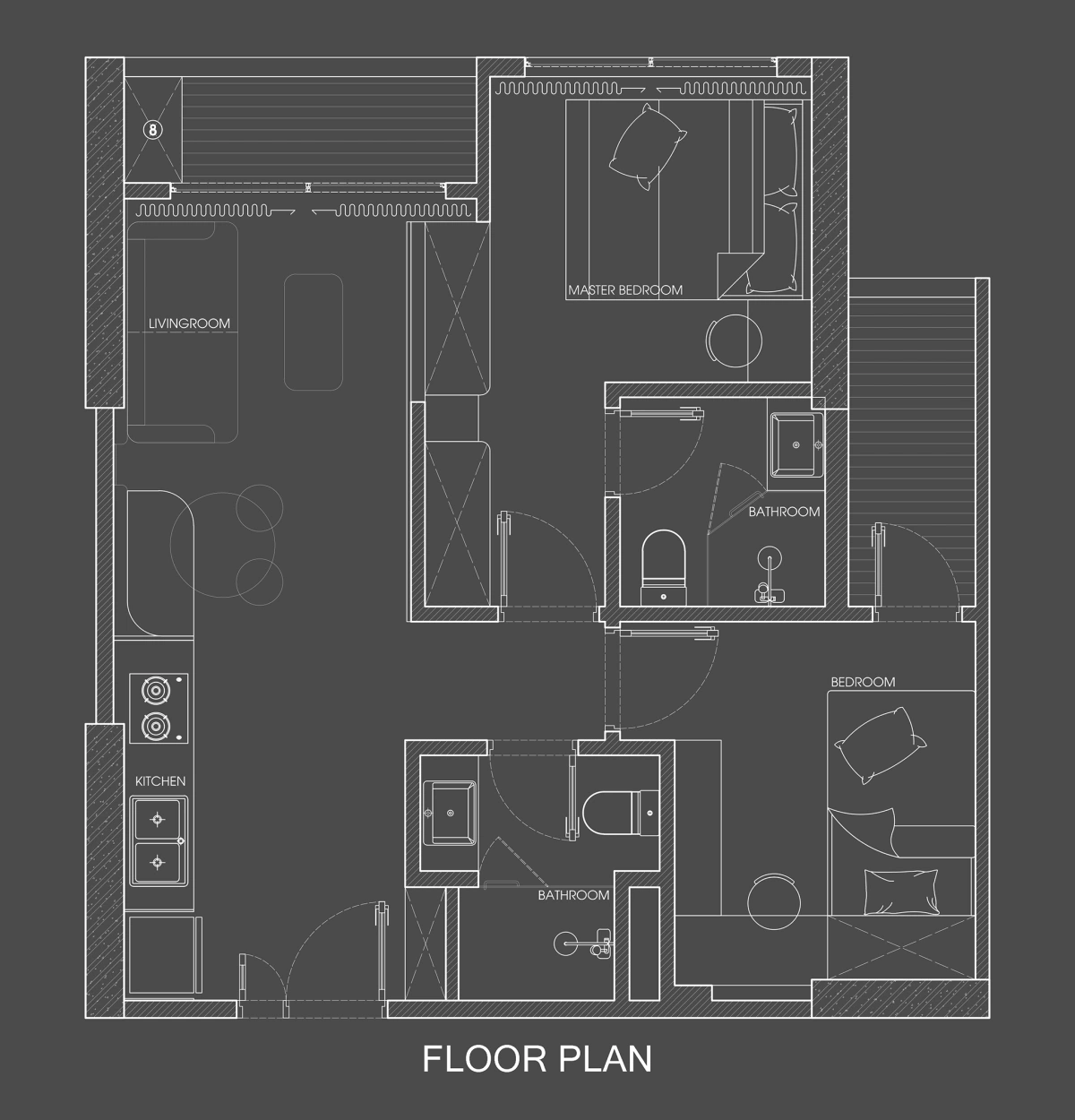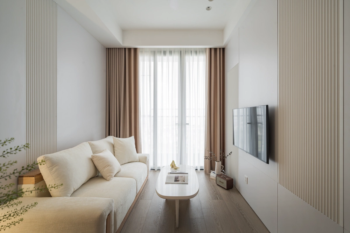 Căn hộ có diện tích 55 m2 có công năng chính gồm 2 phòng ngủ, khu tiếp khách, bếp – ăn và 2 phòng vệ sinh. Nhằm khắc phục hạn chế về diện tích, KTS đã chọn phương án thiết kế căn hộ với tone màu trung tính, hiện đại. Nội thất được tiết giảm tối đa nhưng vẫn đủ tiện nghi cho nhu cầu sinh hoạt, học tập, nghỉ ngơi của các thành viên trong gia đình.