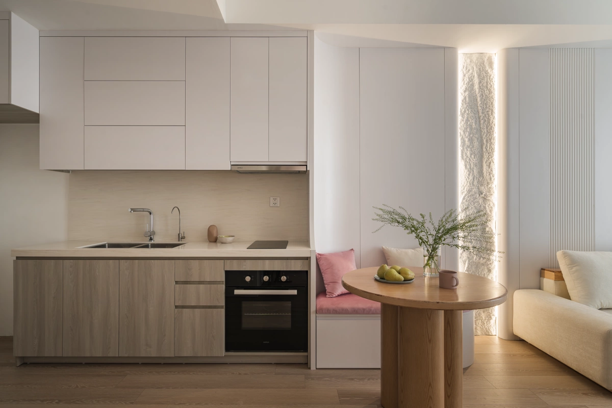 Phòng khách và bếp – ăn nằm liên thông, giúp tối ưu diện tích cho không gian sinh hoạt chung. Vật liệu chủ đạo là gỗ công nghiệp phủ melamine, thẩm mỹ và tiết kiệm ngân sách thi công.