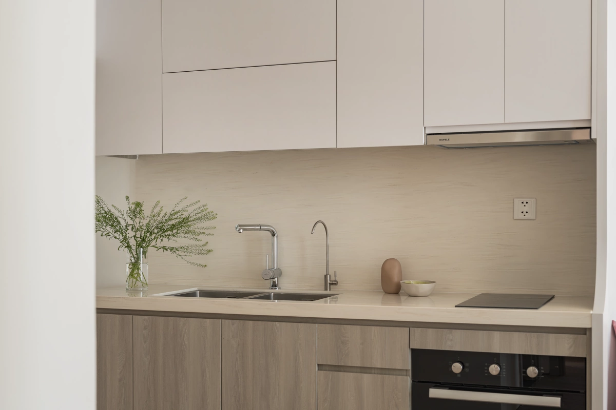 Hệ tủ bếp chữ I được bố trí tiện nghi, gọn gàng.