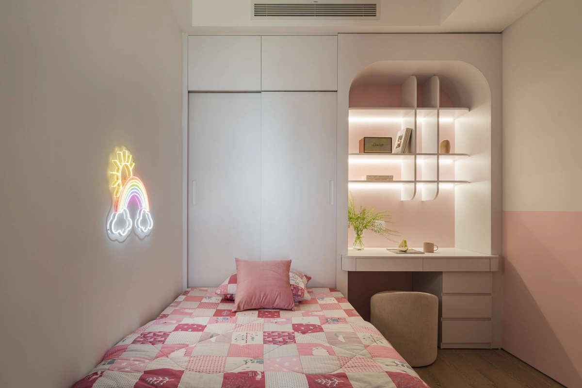 Phòng ngủ con với tone hồng theo sở thích. Dù diện tích nhỏ nhưng vẫn được bài trí đầy đủ hệ tủ quần áo, góc học tập.