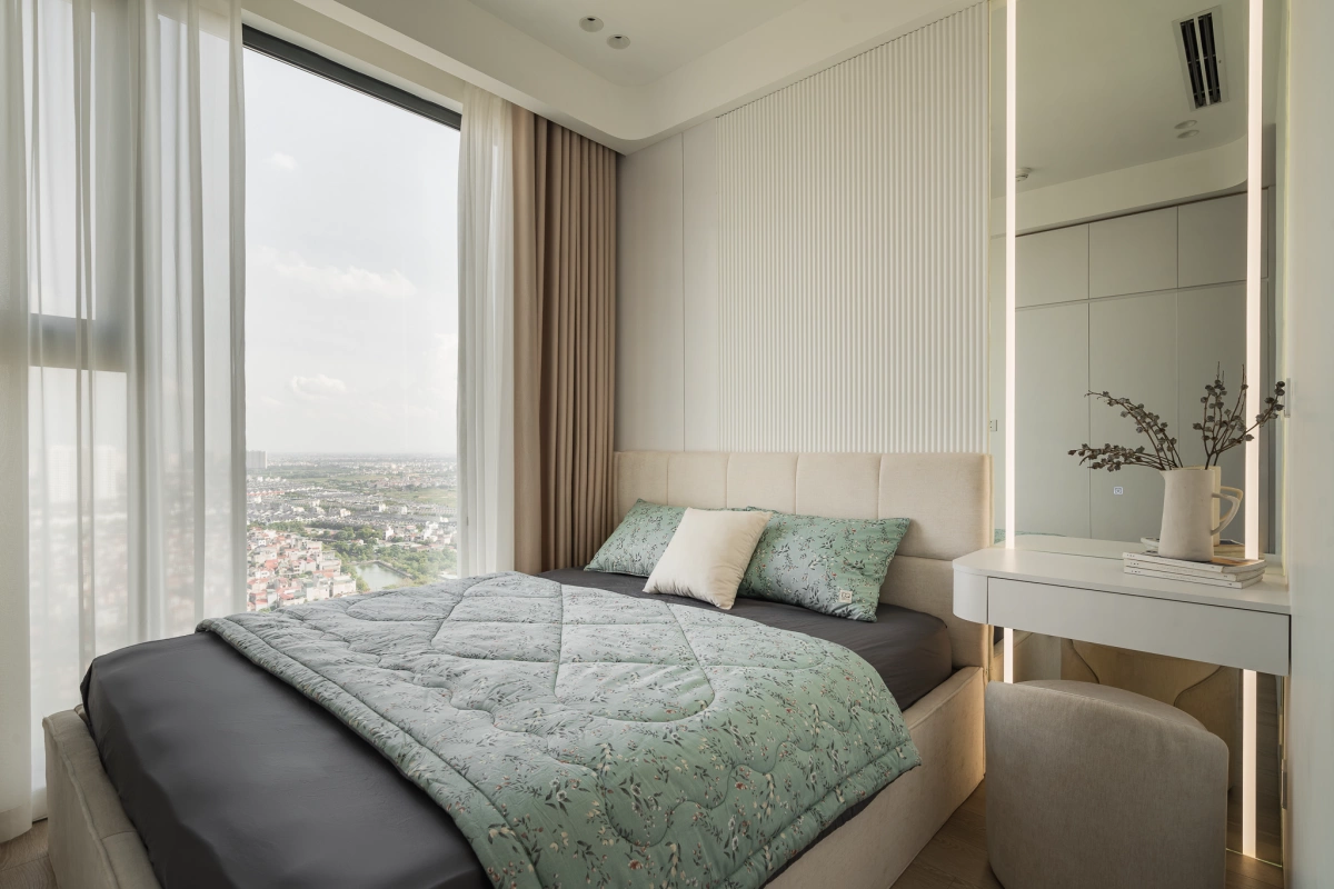 Phòng ngủ chính luôn tràn ngập ánh sáng tự nhiên nhờ vách kính lớn, tầm nhìn thoáng đãng hướng ra khung cảnh thành phố.