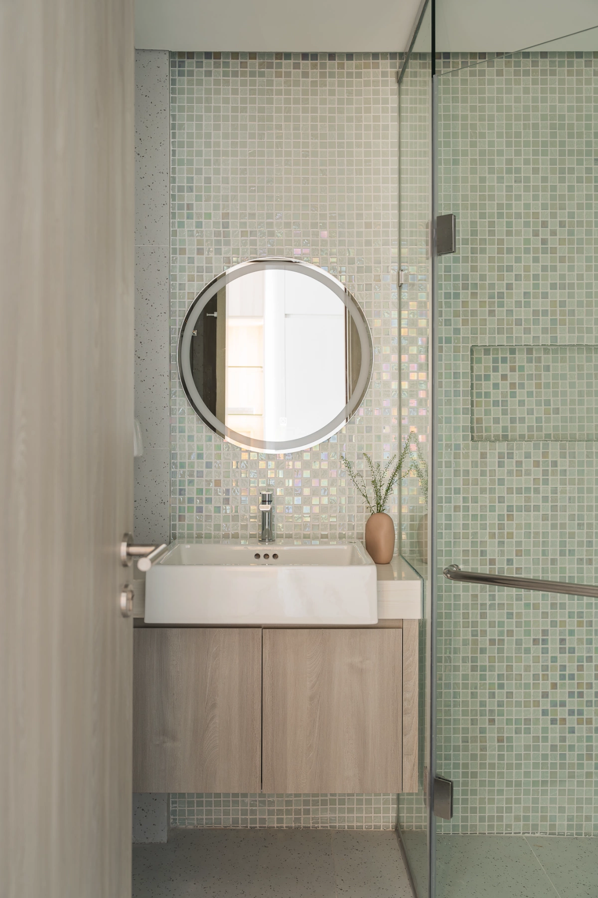 Phòng vệ sinh với vách tắm đứng bằng kính trong suốt để tiết kiệm diện tích, tạo cảm giác không gian thoáng rộng.