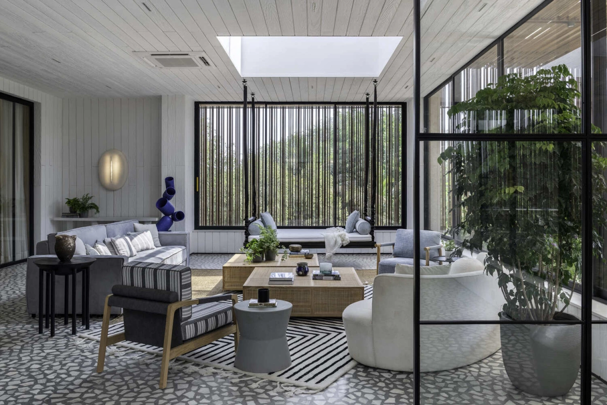 Toàn bộ khu tiếp khách kiêm thư giãn nằm dưới mái hiên, được kết nối trực tiếp với sân vườn, hồ bơi, xóa nhòa ranh giới giữa bên trong và ngoài.