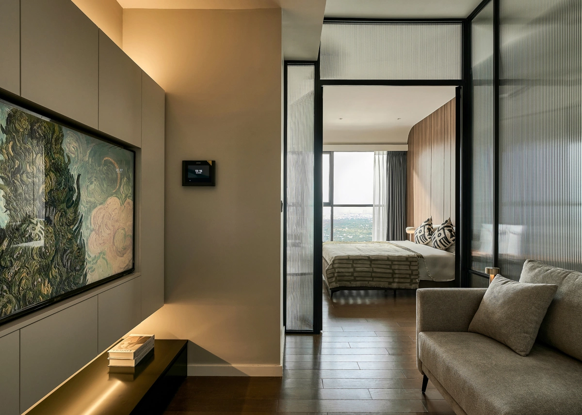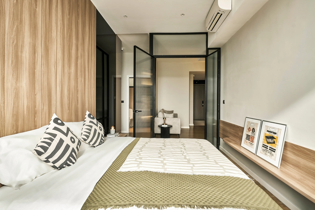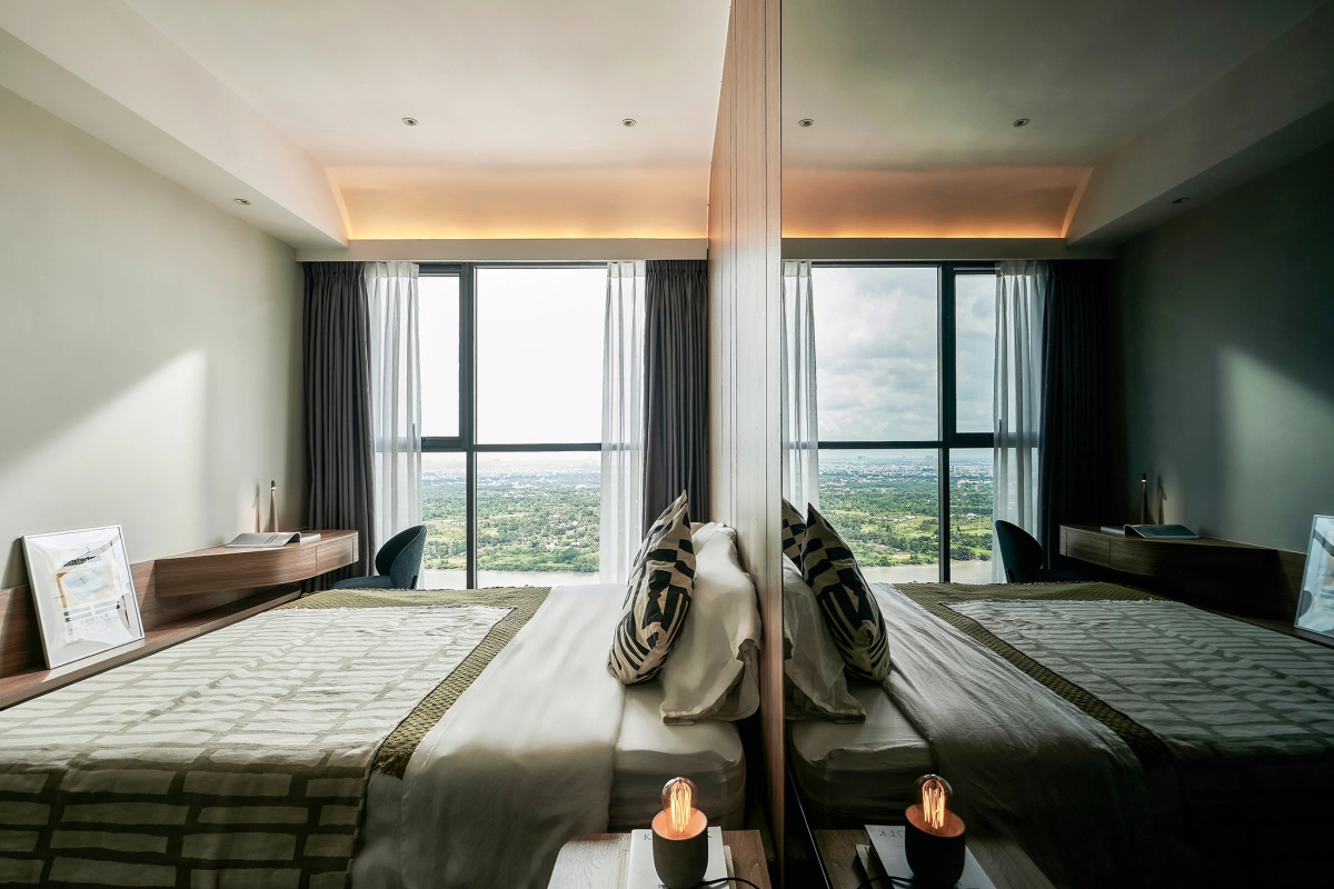 Nội thất phòng ngủ theo hướng tối giản, chủ yếu là thiết bị liền tường để tạo cảm giác thoáng rộng.