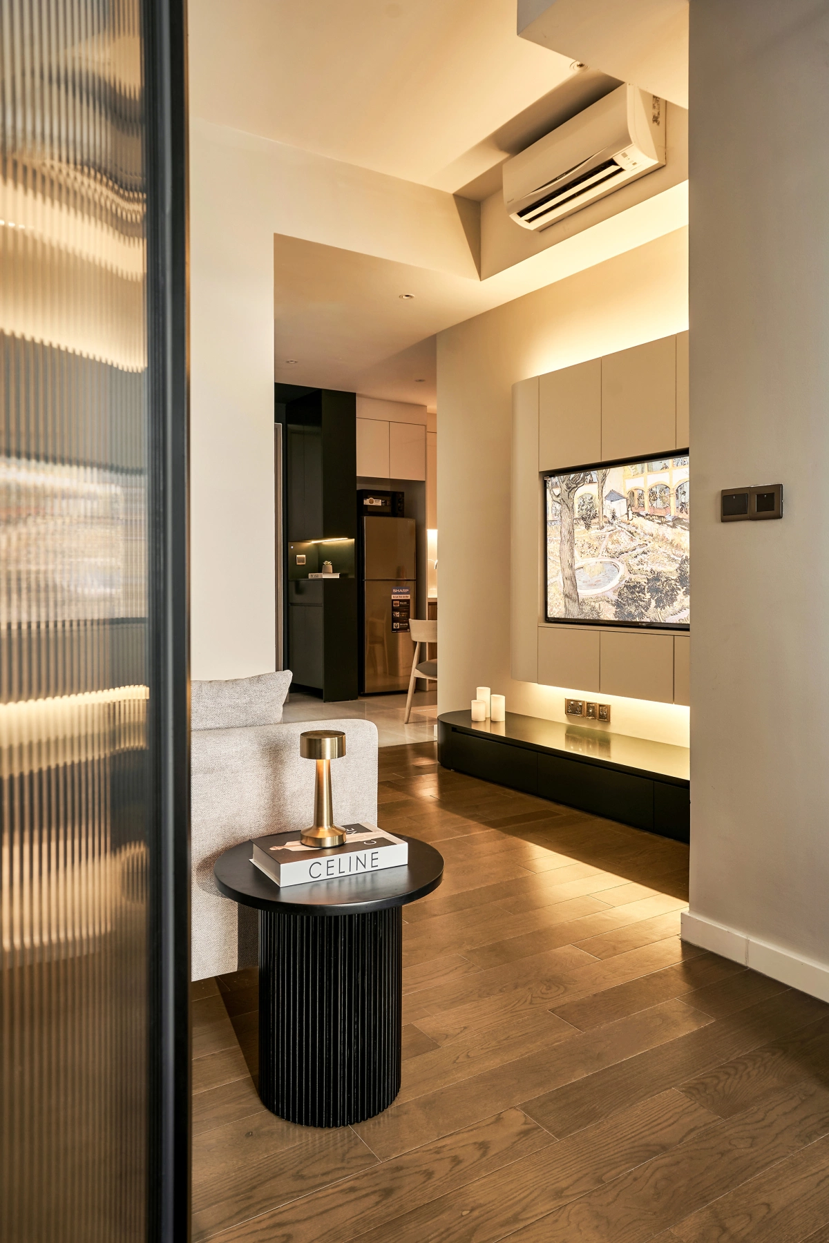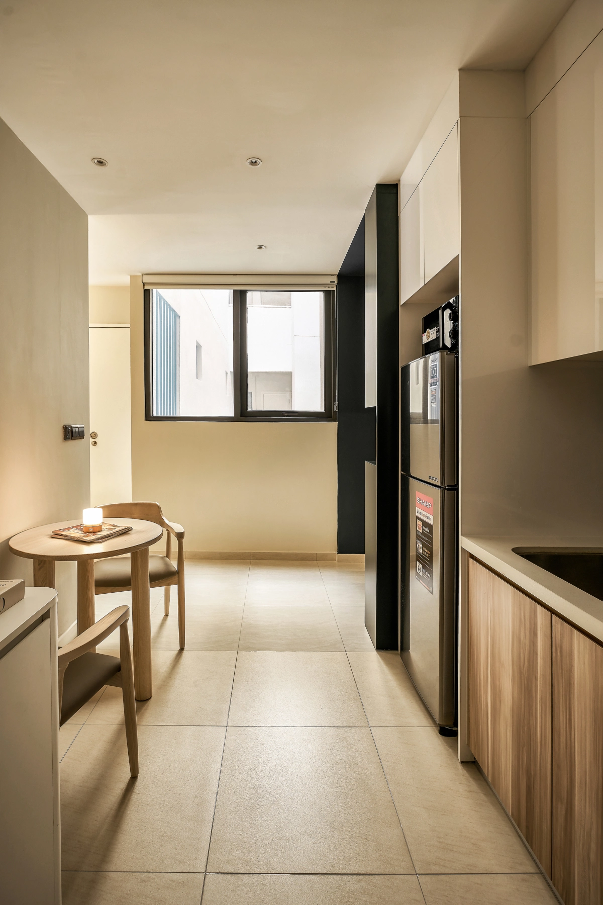 Căn hộ có diện tích 45 m2 gồm một phòng khách, bếp – ăn và một phòng ngủ. Điểm nhấn nằm ở vách kính ngăn giữa phòng khách và ngủ, giúp tăng sự riêng tư và không gian vẫn ngập ánh sáng.