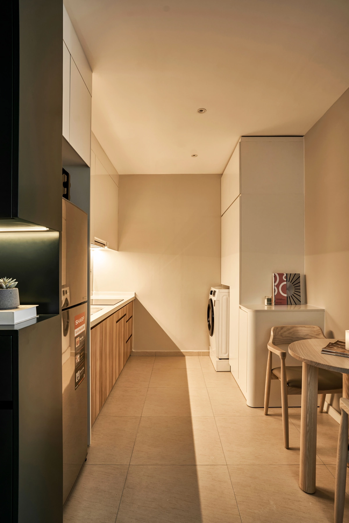 Phòng bếp kiêm khu giặt sấy gọn gàng nhờ hệ tủ sát trần có khoang lưu trữ rộng.