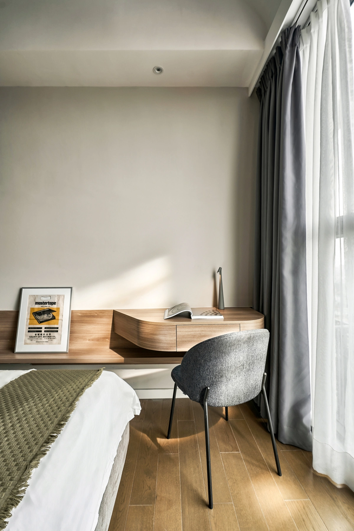Phòng ngủ chính luôn ngập tràn ánh sáng dù diện tích nhỏ, nhờ tận dụng triệt để nguồn sáng từ hai phía.