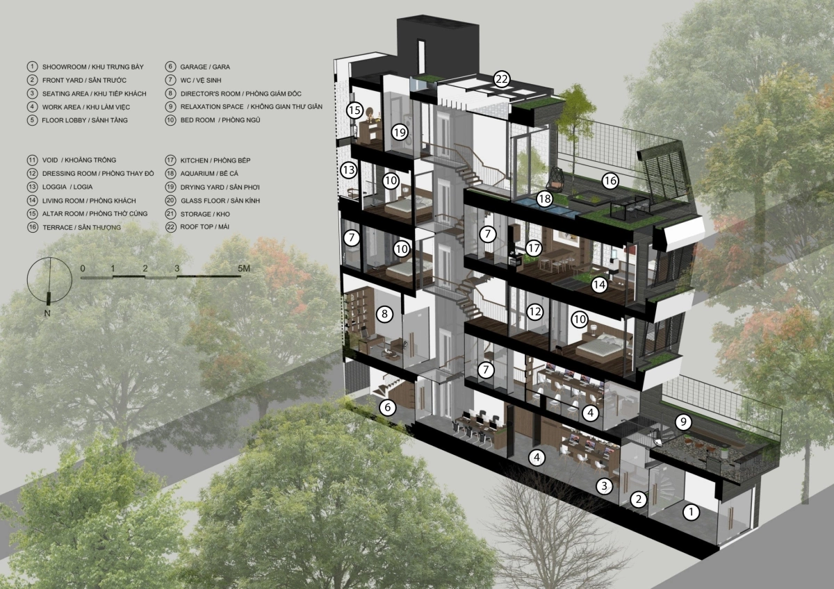 Ngôi nhà được sử dụng để ở và kinh doanh. Tầng 1 được dùng làm showroom trưng bày, tầng 2 là không gian văn phòng. Còn tầng 3, 4 và 5 được bố trí làm nơi ở của gia đình 5 người với đủ các công năng cần thiết.