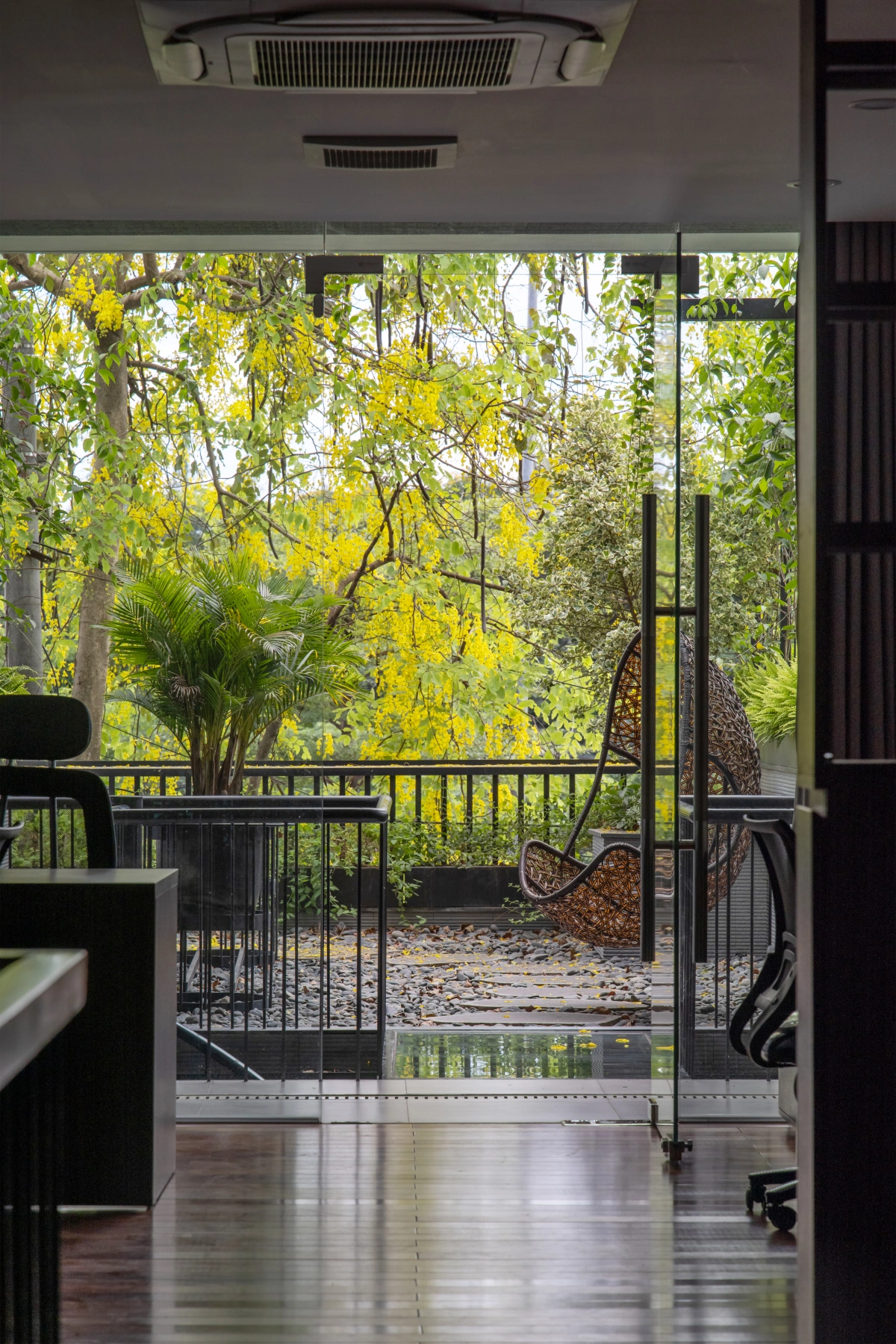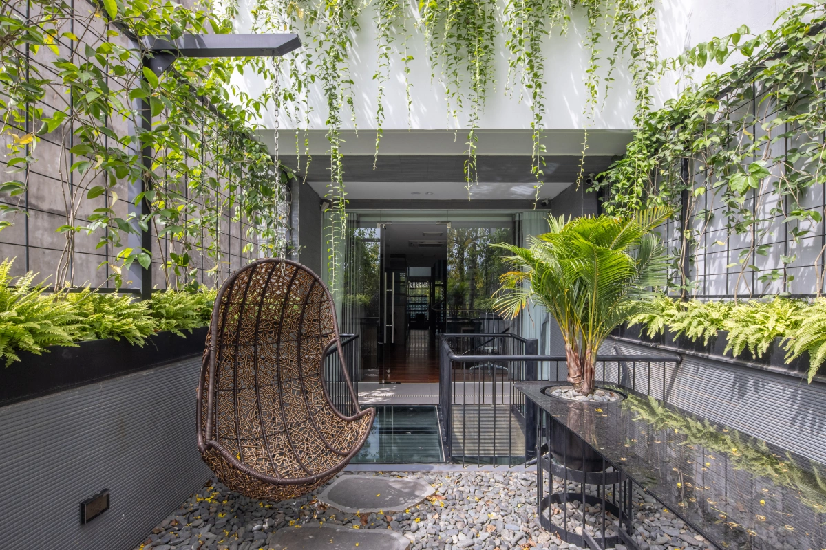 Ban công tầng 2 là khu vực nghỉ ngơi, thư giãn của nhân viên văn phòng với hệ cây xanh, xích đu, ghế nghỉ,…