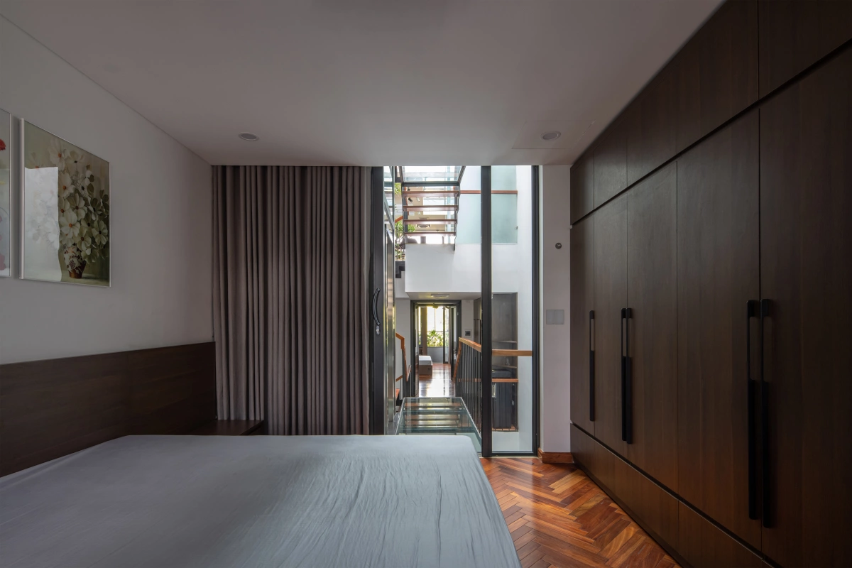 Hai phòng ngủ được bố trí ở tầng 3 cùng một không gian nghỉ ở sảnh tầng. Phòng ngủ phía sau nhà sẽ cao hơn phòng ngủ phía trước để đảm bảo thông thoáng.