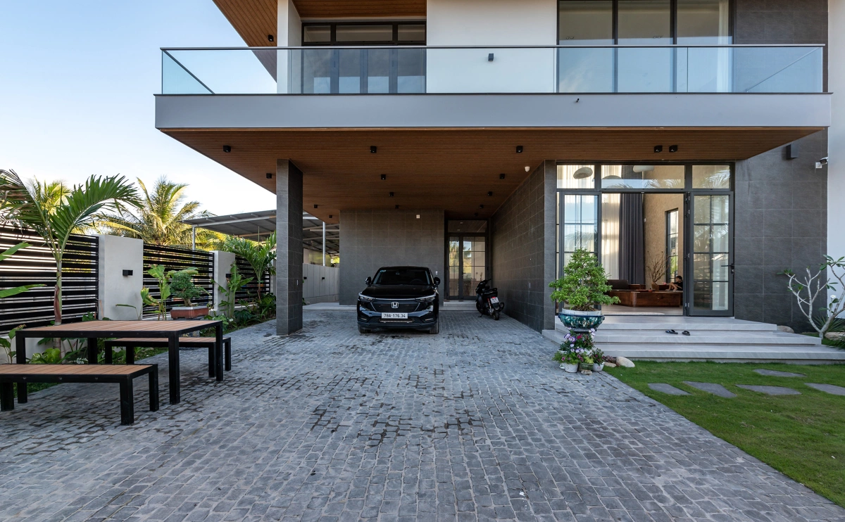KTS dành riêng một khoảng sân có mái hiên để đáp ứng cùng lúc hai công năng là đậu xe và tổ chức đãi khách mỗi dịp giỗ, mà không cần dùng đến mái tôn – gây nóng và ồn.