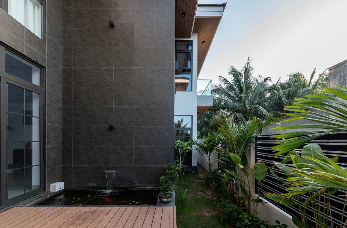 Sau nhà là khoảng sân vườn và hồ cá Koi, tăng diện tích mảng xanh, mặt nước, góp phần điều hòa nhiệt độ cho không gian sống.
