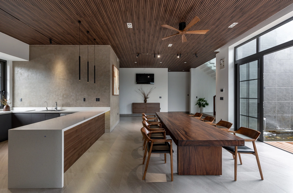 Phòng bếp – ăn hướng tầm nhìn rộng thoáng ra hồ cá và sân sau.