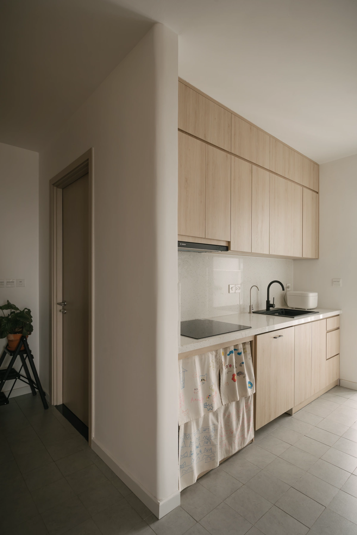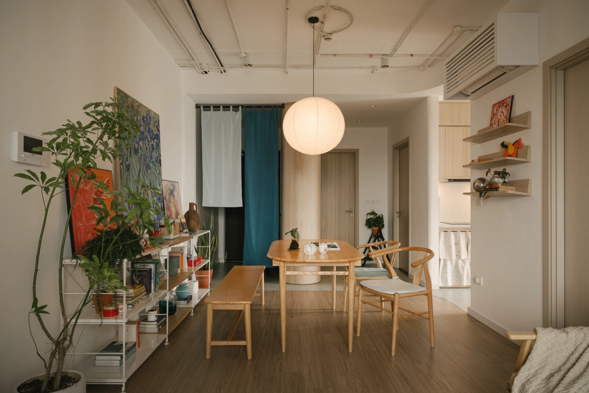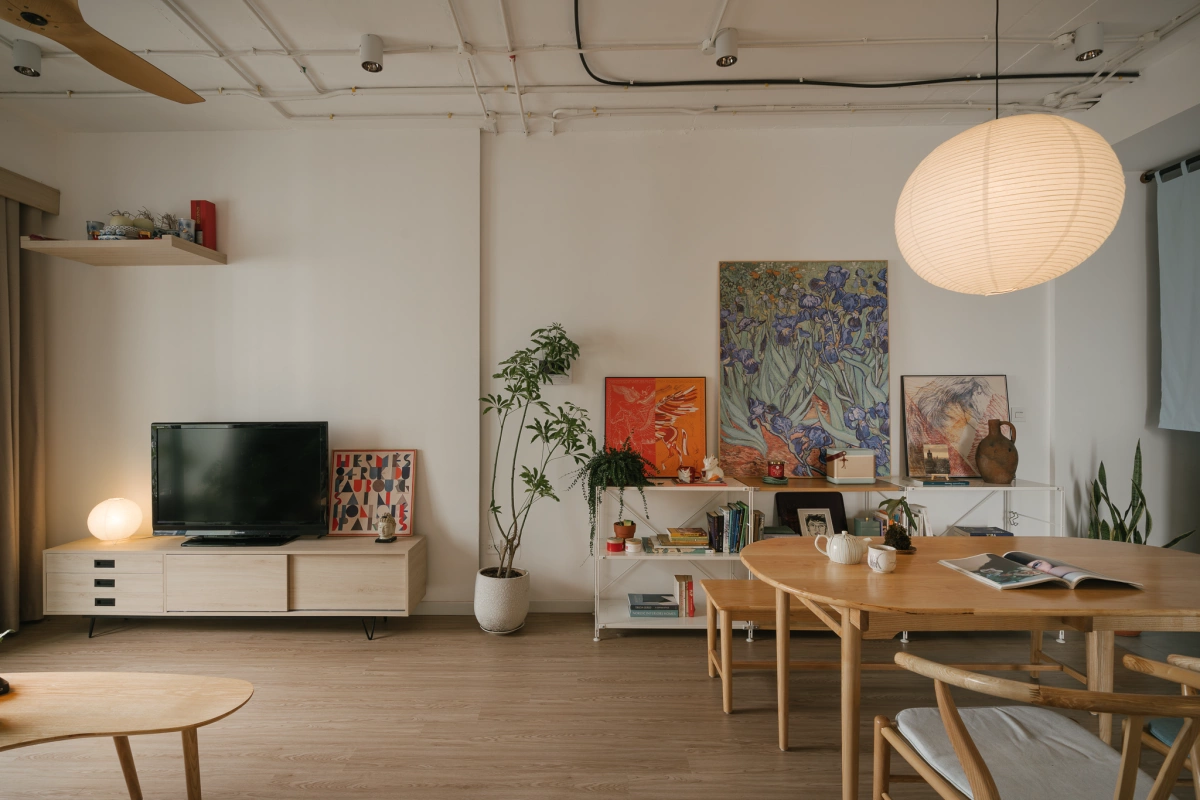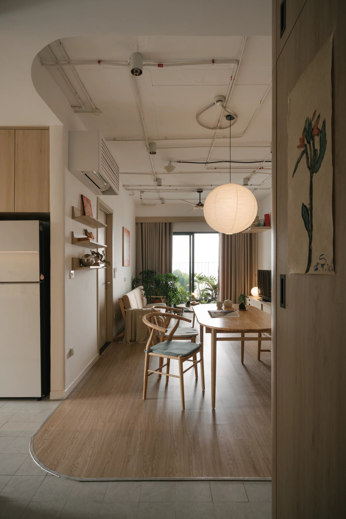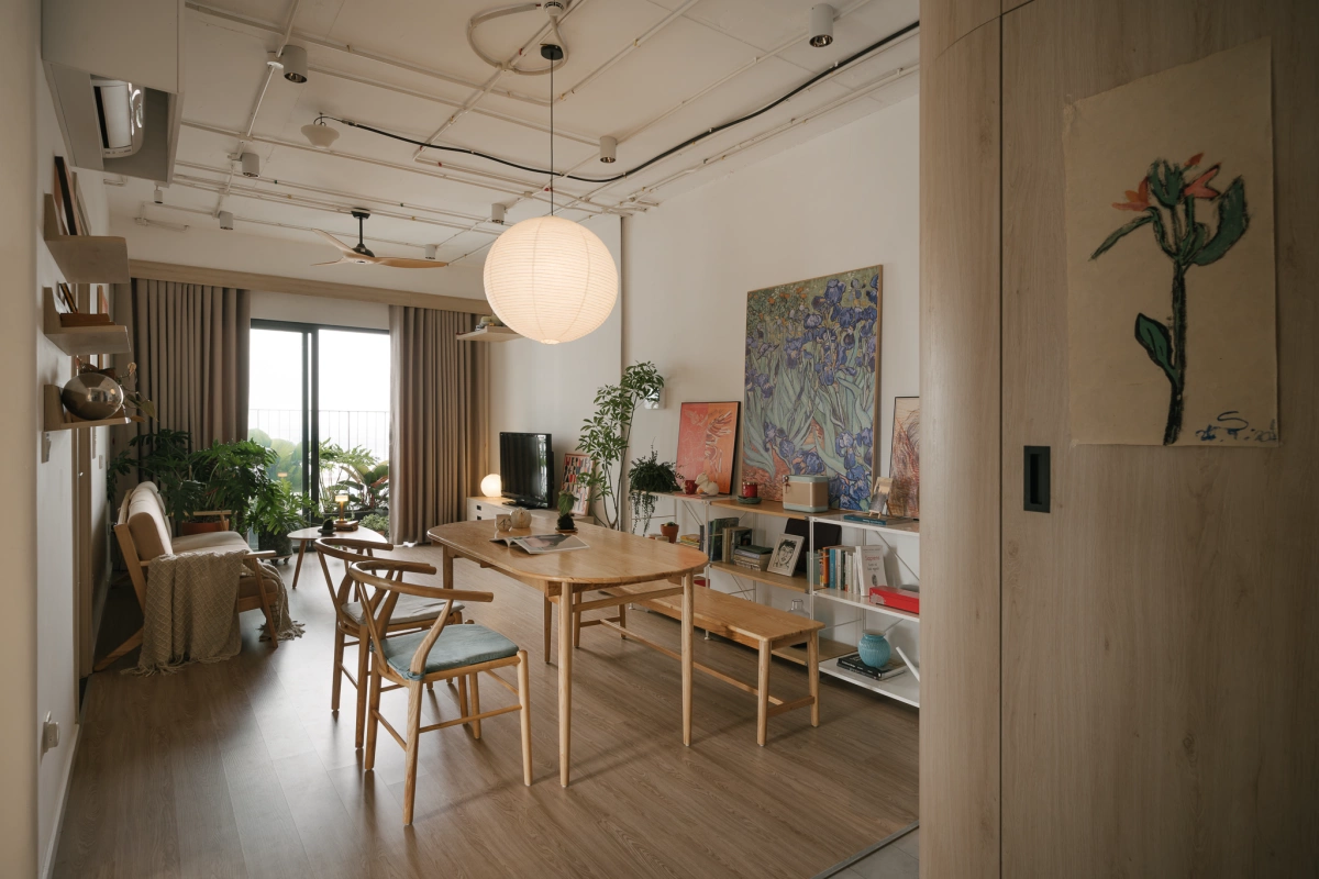 Hệ sàn nhựa giả gỗ được lát trực tiếp là sàn gạch cũ và bổ sung nhiều đồ gỗ rời. Màu gỗ của sàn và đồ gia dụng tạo cảm giác ấm cúng, giúp cân bằng lại cảm giác lạnh của hệ trần hở.