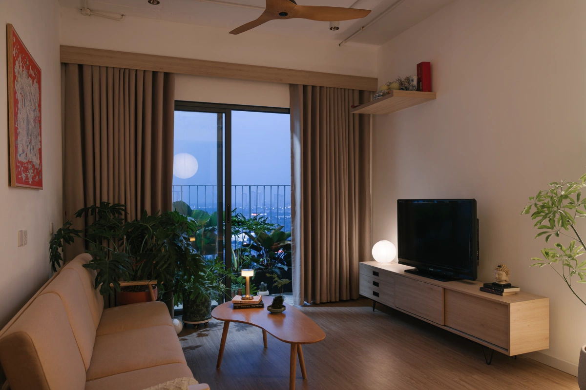 Căn hộ có quy mô 76 m2, là nơi sinh sống của một gia đình trẻ gồm 2 vợ chồng, 1 con nhỏ và bà nội. Công năng chính gồm 2 phòng ngủ, không gian sinh hoạt chung và 2 nhà vệ sinh.