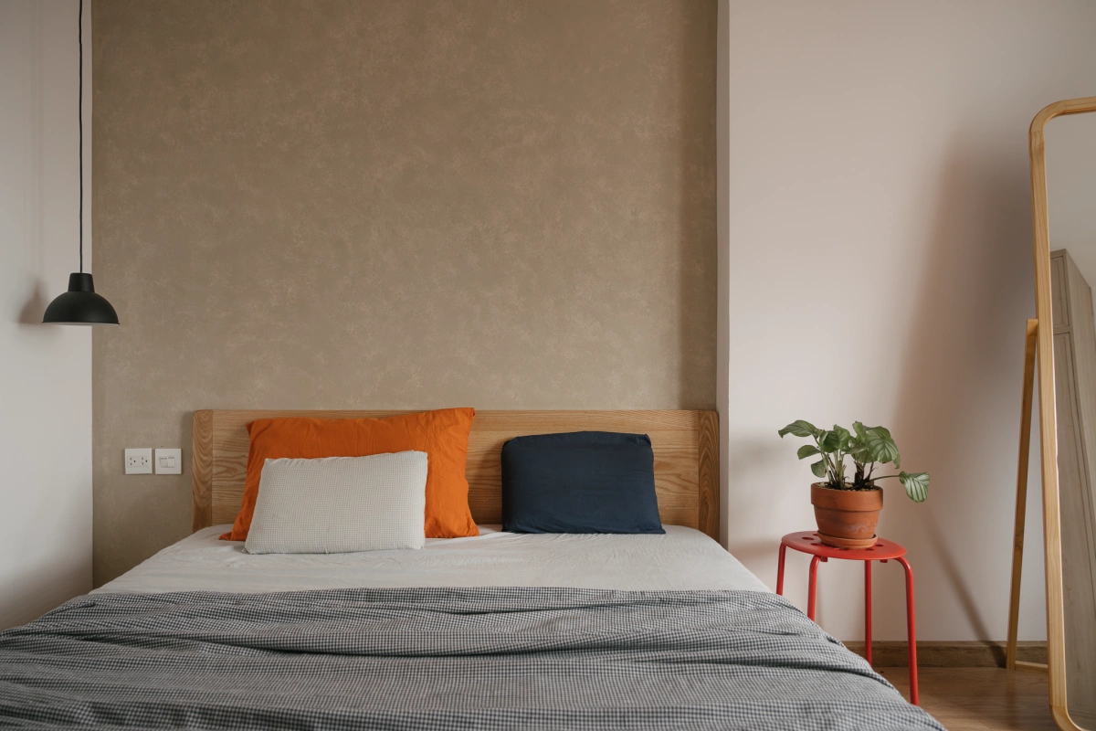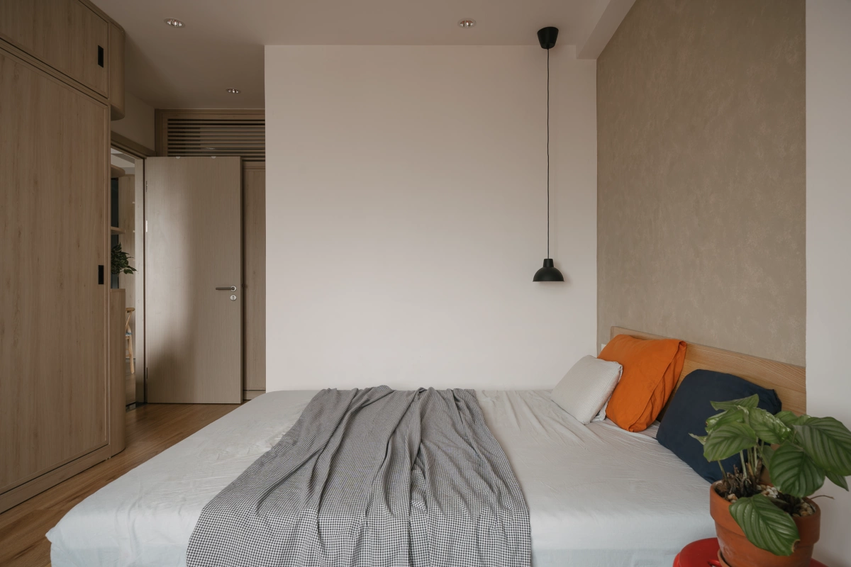 Phòng ngủ chính với nội thất tối giản, được gia chủ tự bày trí đồ dùng, cây cối.