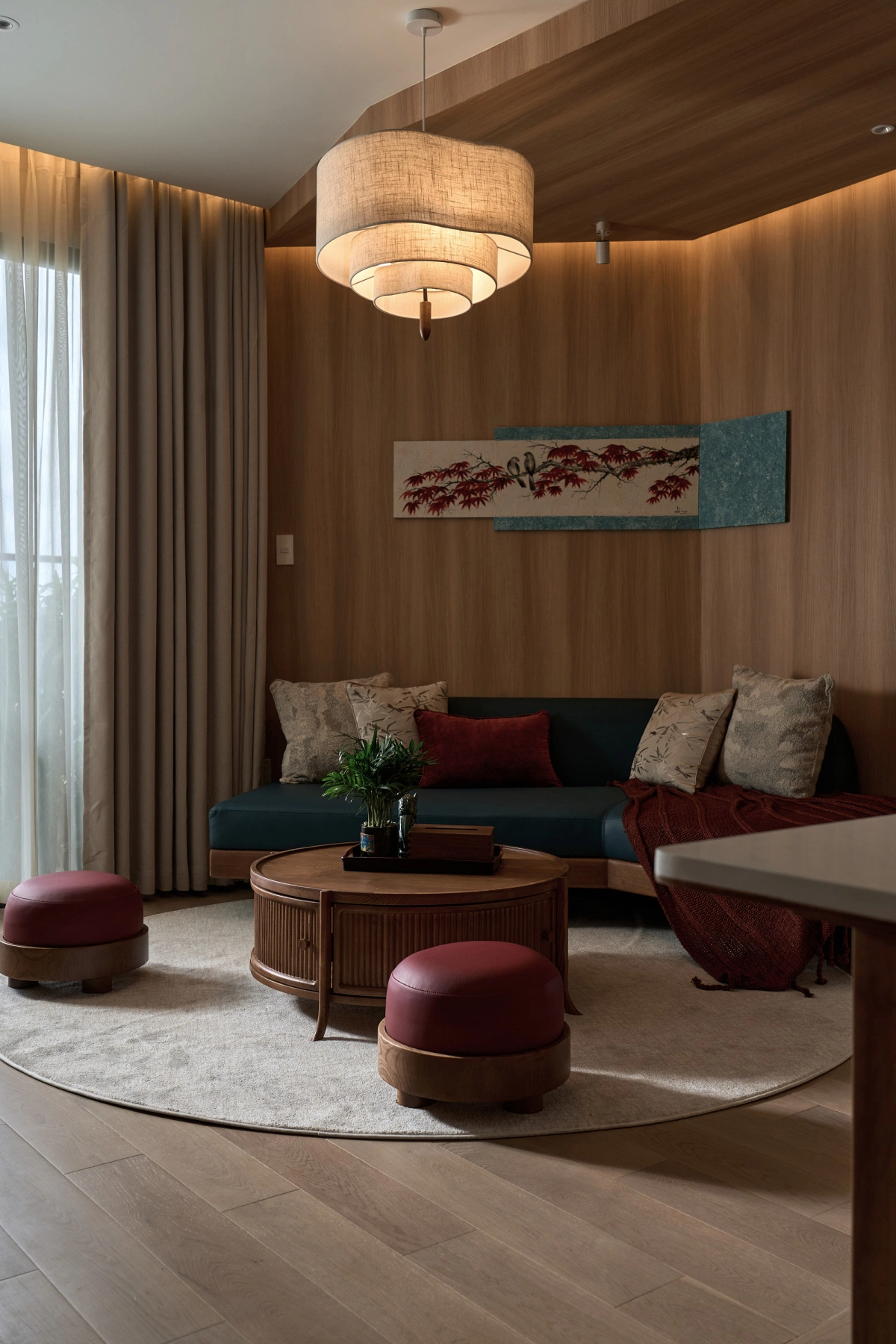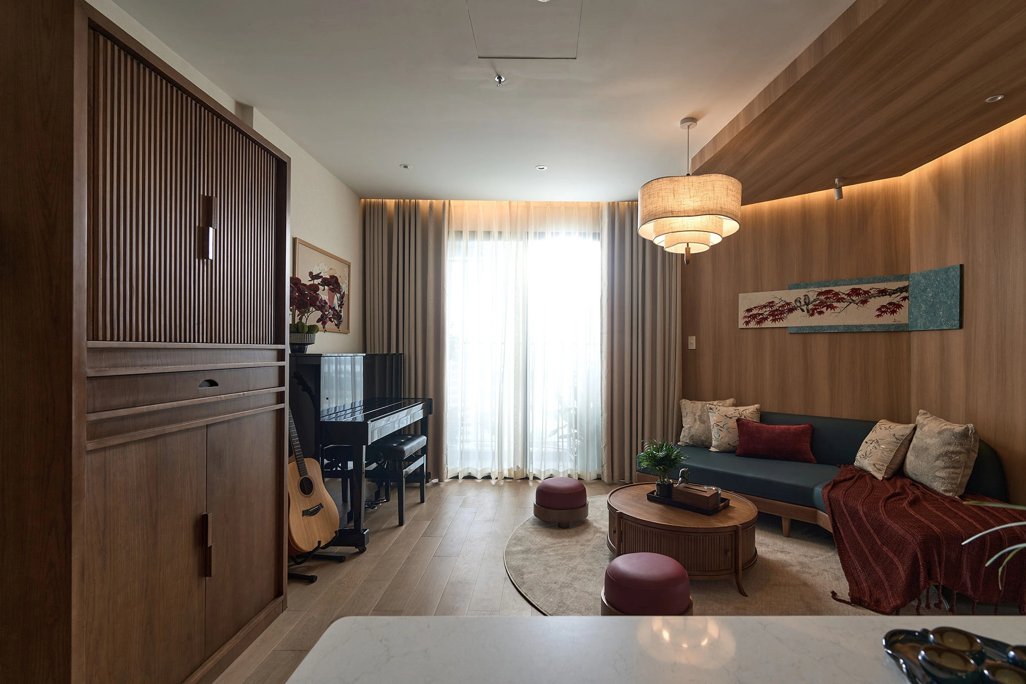 Nhóm thiết kế chọn mở rộng không gian phòng khách bằng cách thu nhỏ một phần phòng phía sau. Bên cạnh đó là phương án giật cấp trần khu ngồi sofa, tạo thành một mái hiên nhỏ trong căn hộ.