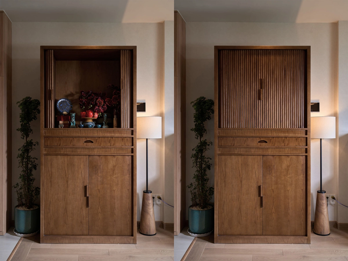 Tủ thờ được thiết kế cửa xếp linh hoạt, có thể đóng mở tùy theo nhu cầu sử dụng.