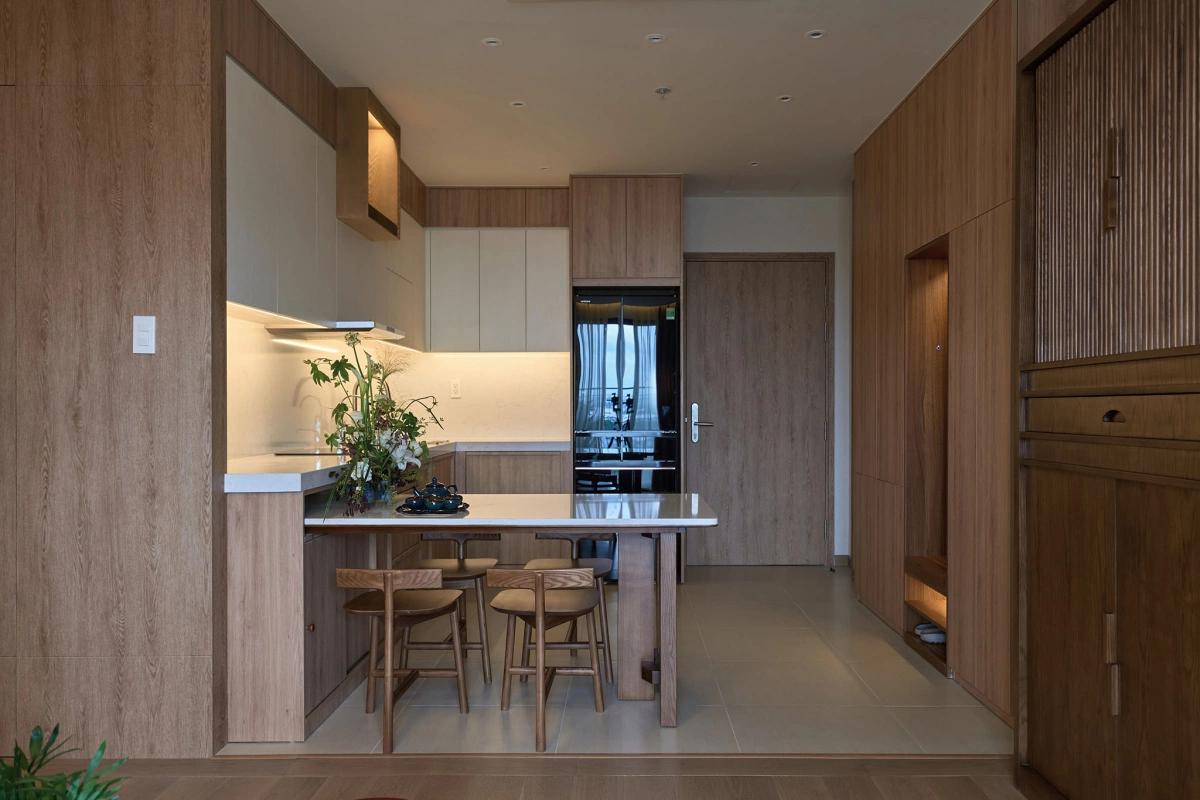 Bếp được bổ sung thêm bàn đa năng vừa làm đảo bếp, vừa là bàn ăn. Bàn ăn bình thường có thể ngồi 4 người, hoặc kéo dài thành bàn tiệc đủ dùng cho 6-8 người. Ghế đặt gọn dưới gầm bàn để thêm chỗ thao tác.