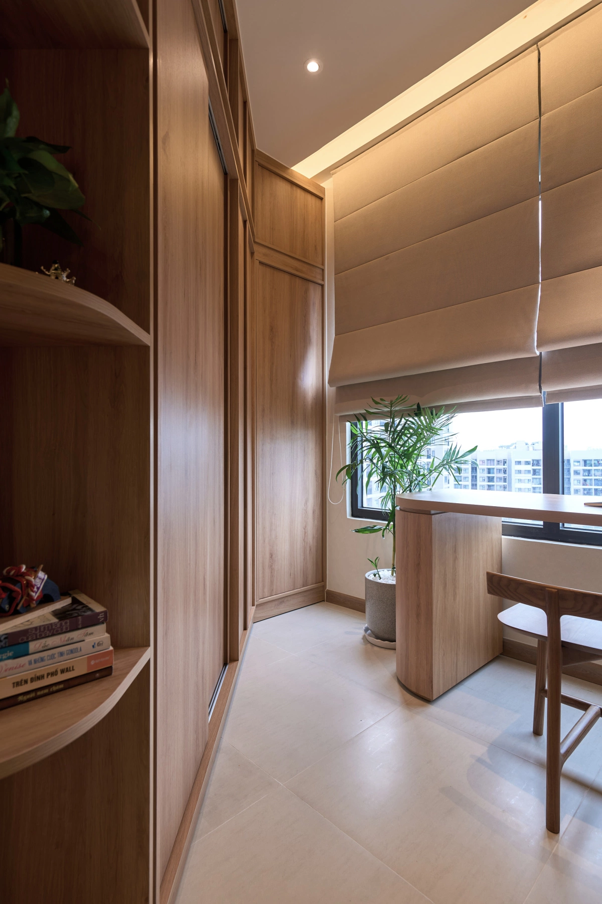 Phòng phía sau sofa được thu nhỏ lại và chuyển thể thành phòng thay đồ, thêm góc nhỏ riêng tư cho chủ nhà. Cửa phòng là kệ sách âm tường có lắp kính mờ, giúp lấy sáng nhưng vẫn đảm bảo riêng tư, kết nối trực tiếp với phòng ngủ master.