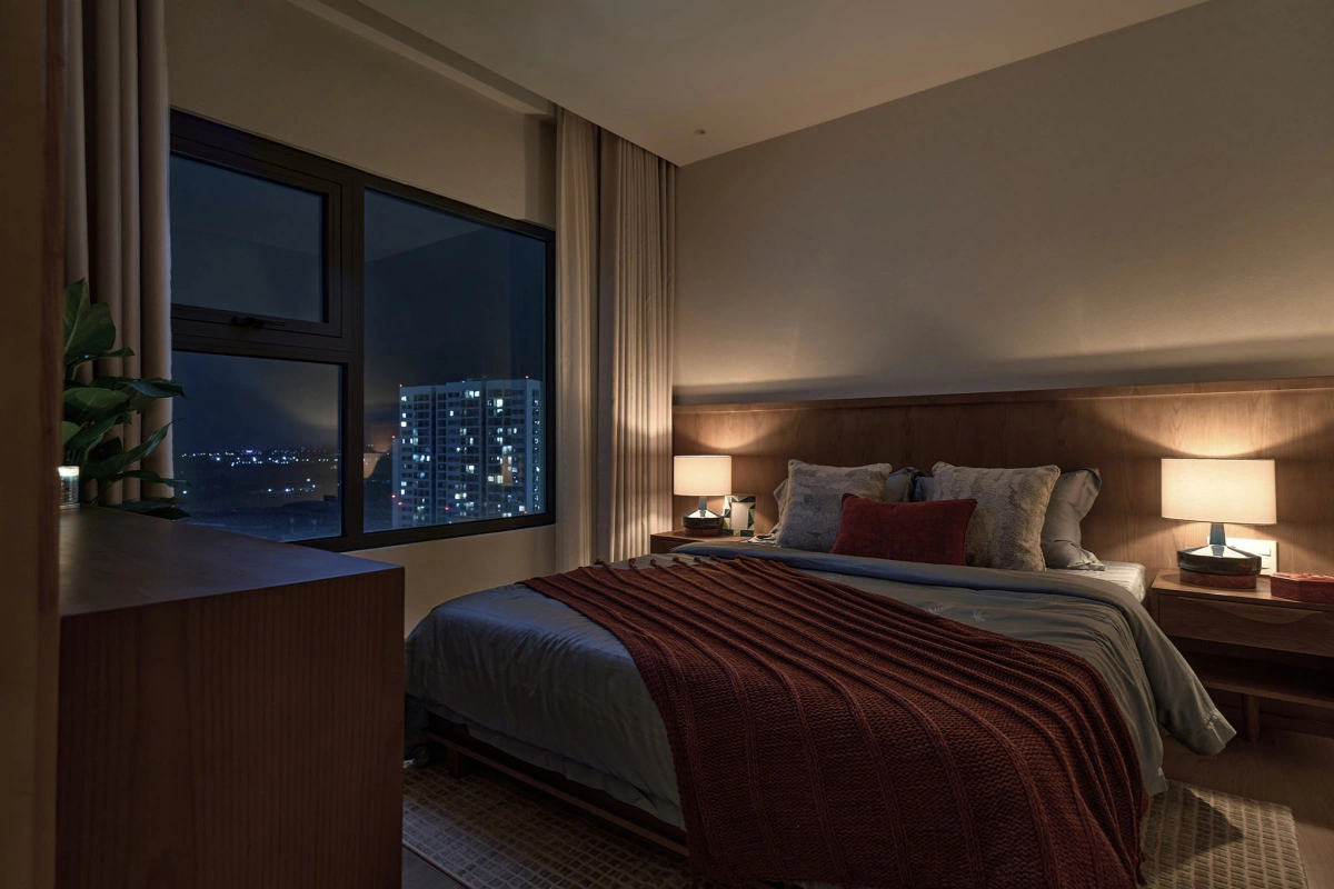 Phòng ngủ chính với nội thất hiện đại, tối giản, màu sắc tự nhiên.