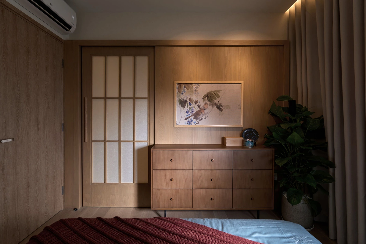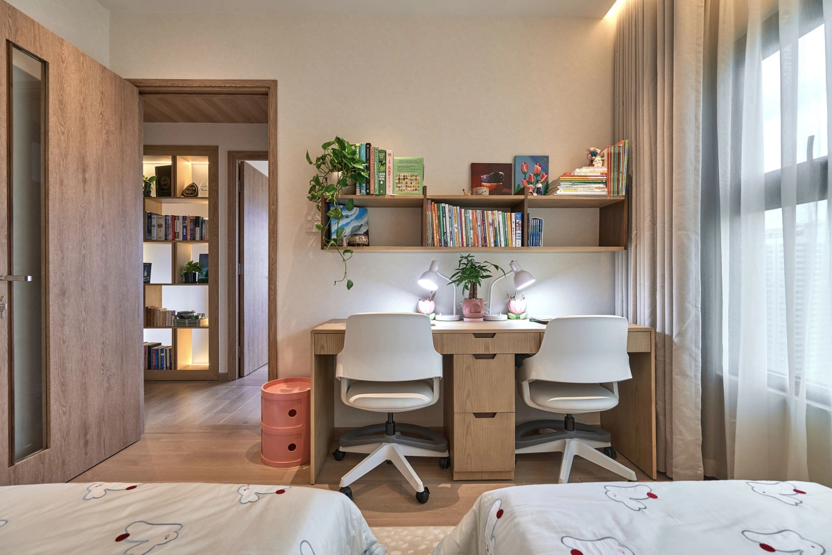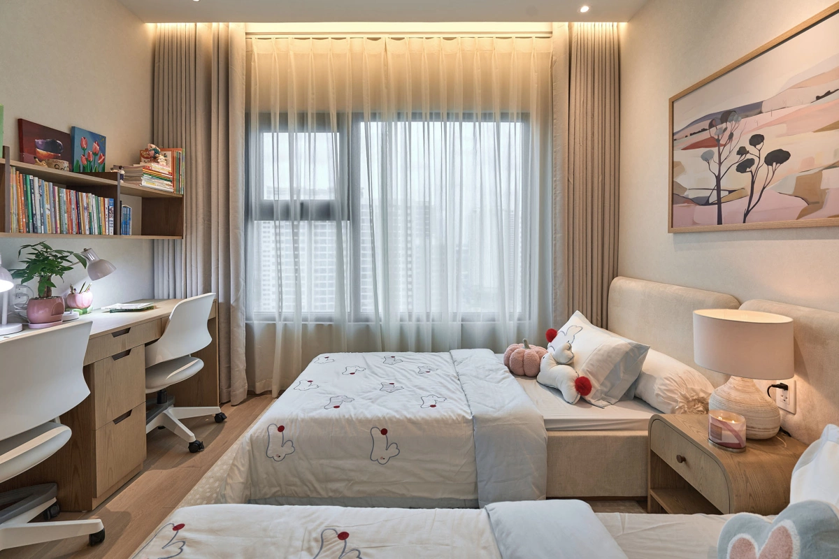 Phòng ngủ cho 2 con được thiết kế rộng rãi hơn, thay đổi toàn bộ hệ tủ đồ nhỏ cũ thành loại lớn. Giường tầng được thay thế bằng 2 giường đơn.