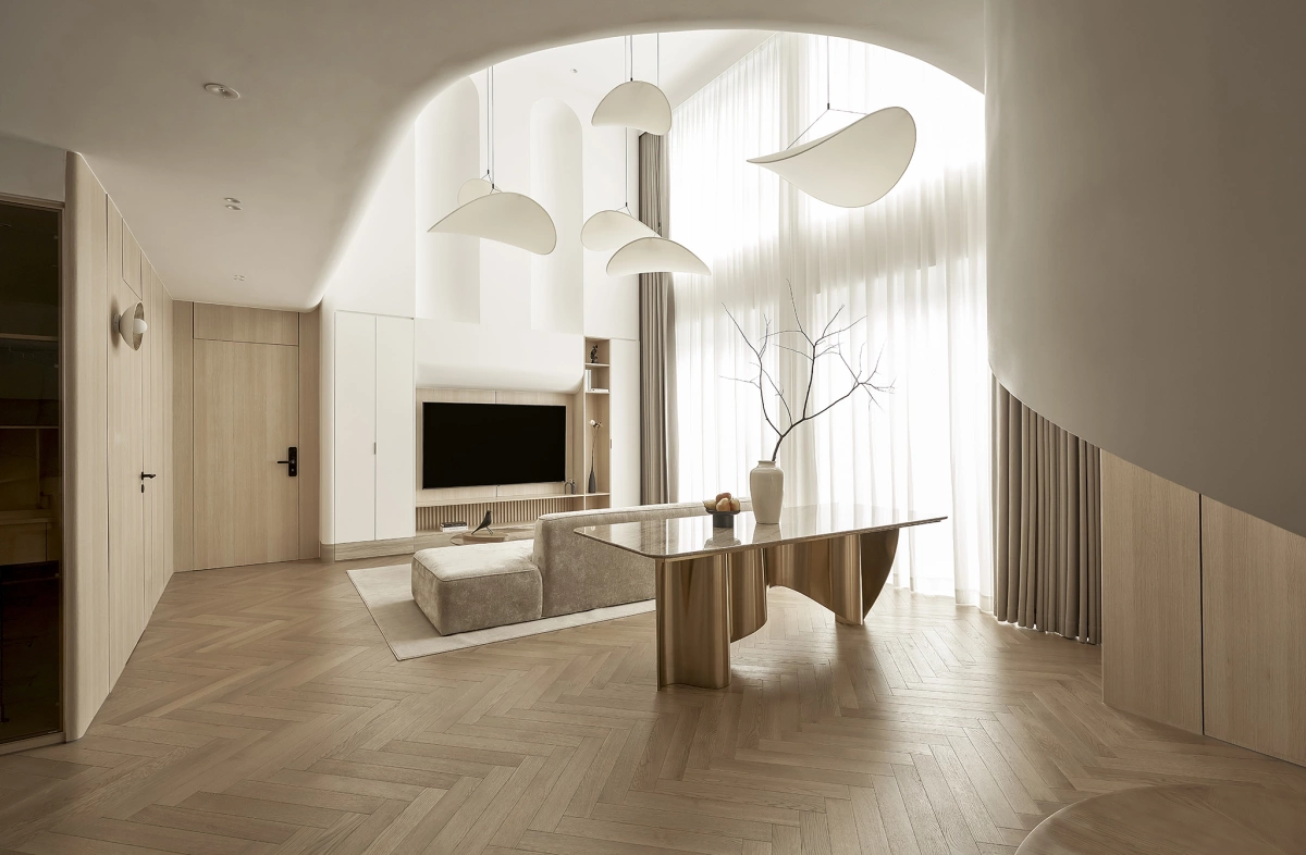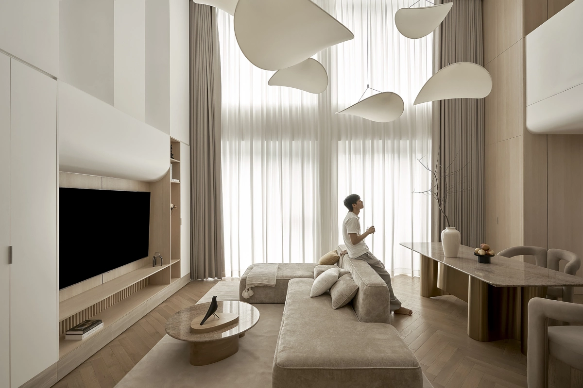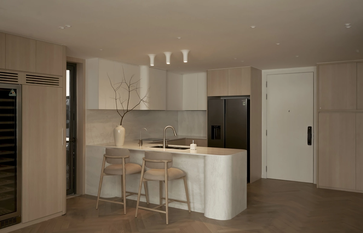 Phong cách thiết kế chủ đạo mang cảm hứng Nhật Bản (Japandi) với tone màu sáng, trắng và nhấn màu gỗ nhẹ nhàng tạo cảm giác ấm cúng.