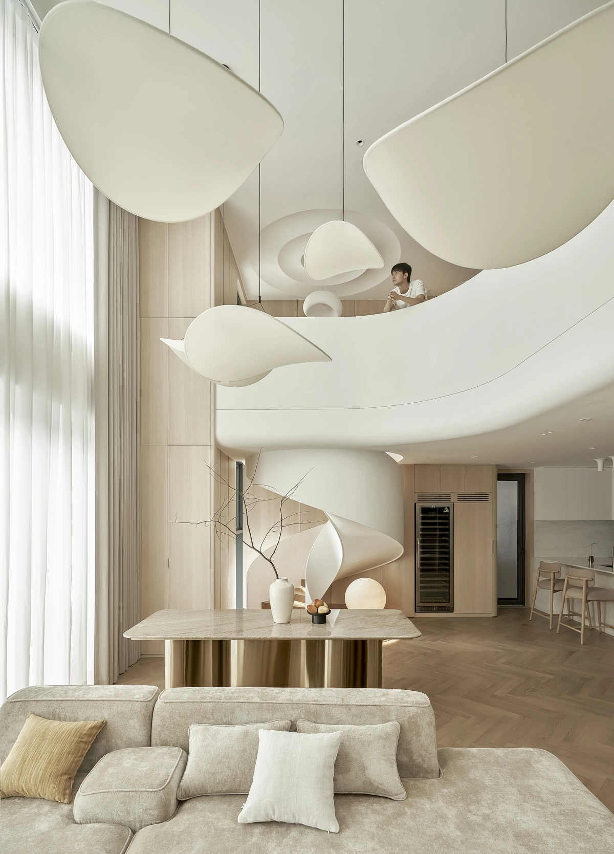 Khu vực thông tầng được bố trí hệ đèn thả trần ấn tượng, hệ cầu thang xoắn ốc giúp không gian giống một nơi trưng bày các tác phẩm nghệ thuật.