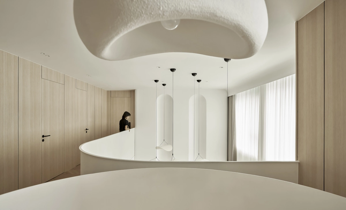 Khu vực thông tầng được bổ sung hệ đèn thả trần, cùng đường nét uốn cong mềm mại giúp tạo điểm nhấn cho không gian. Cùng NHÀ ĐẸP SÀI GÒN tham khảo bài viết sau đây nhé!