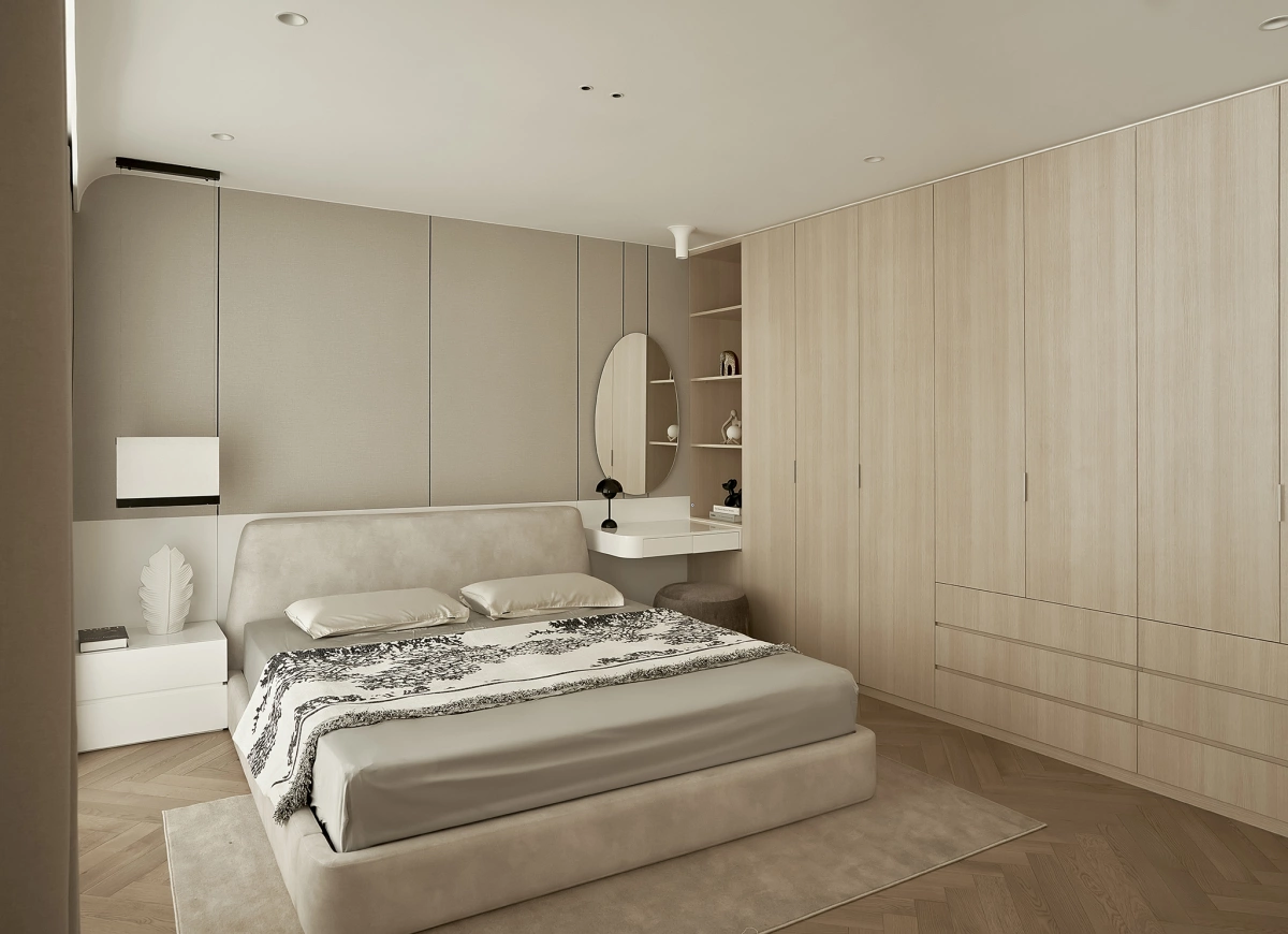 Phòng ngủ chủ yếu sử dụng nội thất liền tường để tối ưu không gian thoáng rộng.