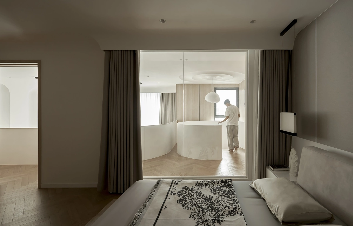 Phòng ngủ chính với hai mặt thoáng, nội thất tối giản, chú trọng giải pháp lấy sáng.