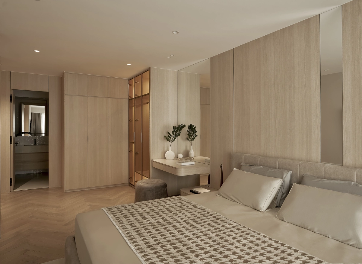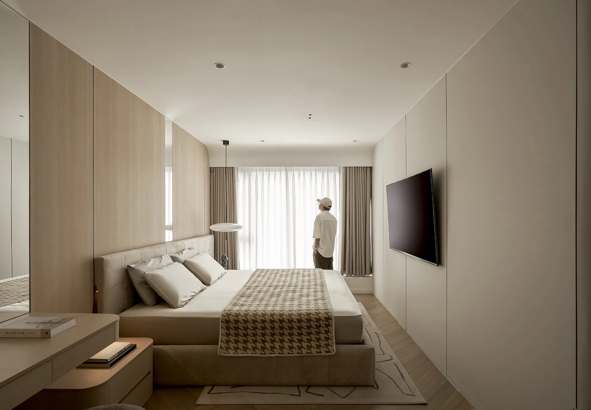 Hệ tủ, giường có tone màu gỗ tự nhiên làm chủ đạo, tăng cảm giác thư giãn cho không gian nghỉ ngơi riêng tư.