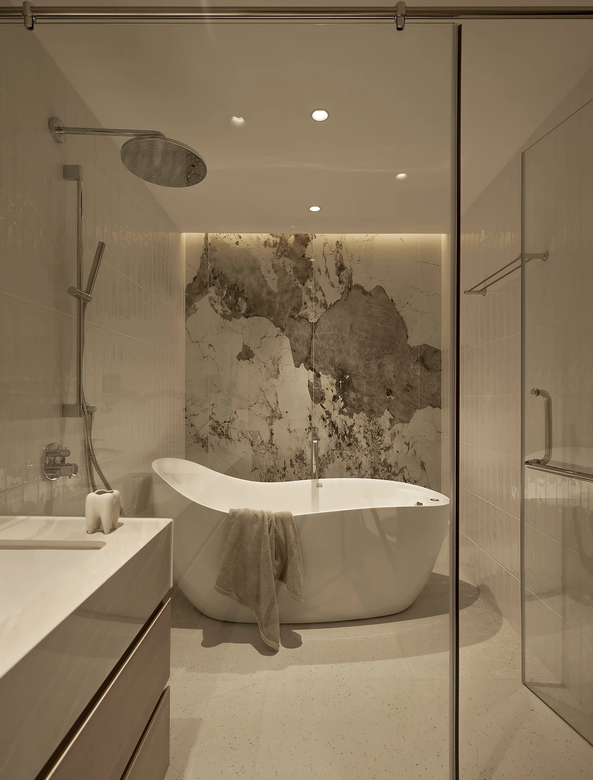 Phòng vệ sinh với bồn tắm nằm giúp tăng yếu tố nghỉ dưỡng, ngăn cách với khu vực bên ngoài bằng vách kính.