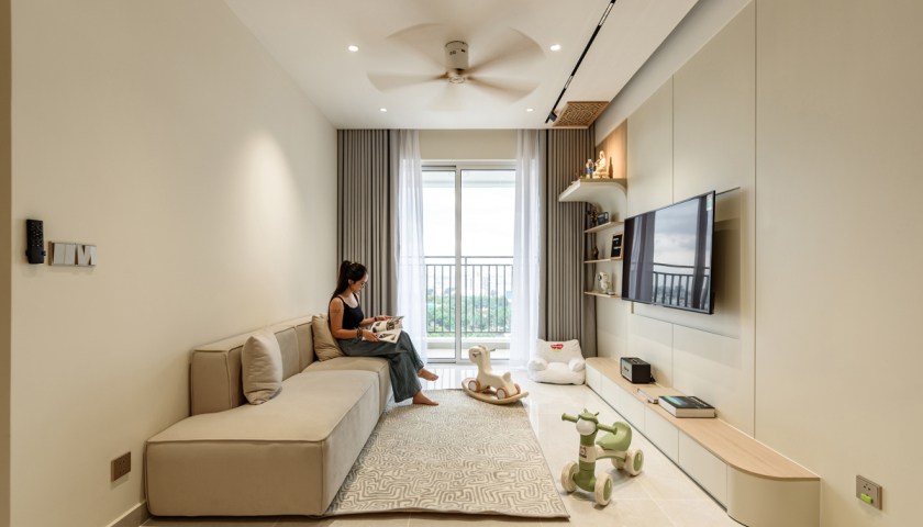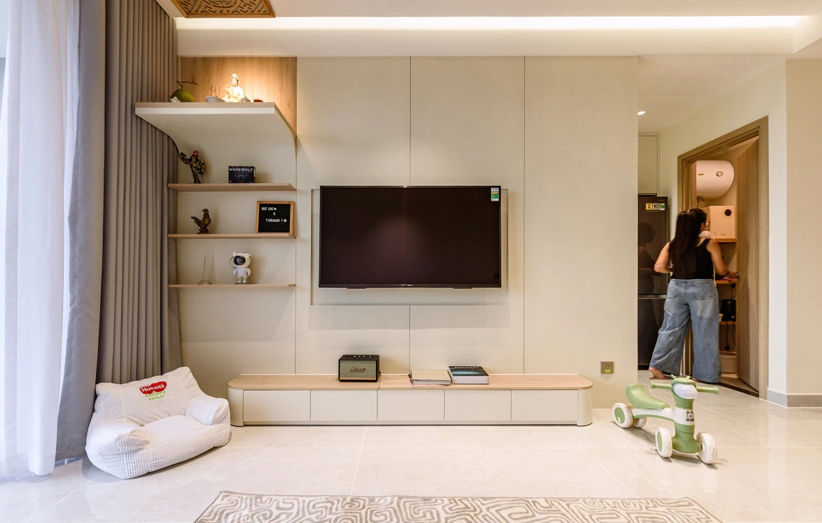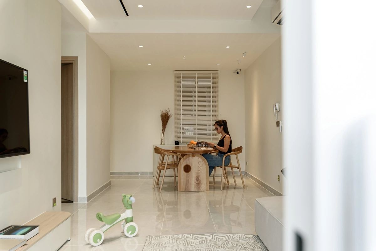 Căn hộ có diện tích 95 m2, là nơi sinh sống của một gia đình trẻ. Công năng chính gồm phòng khách, bếp – ăn, phòng làm việc, một phòng ngủ chính và khu vui chơi cho con. KTS chọn phong cách Nhật Bản (Japandi) làm giải pháp thiết kế cho căn hộ, nhằm đáp ứng yêu cầu của gia chủ về một không gian sống thoáng đãng, ấm cúng, thuận lợi cho việc nuôi dạy con cái.