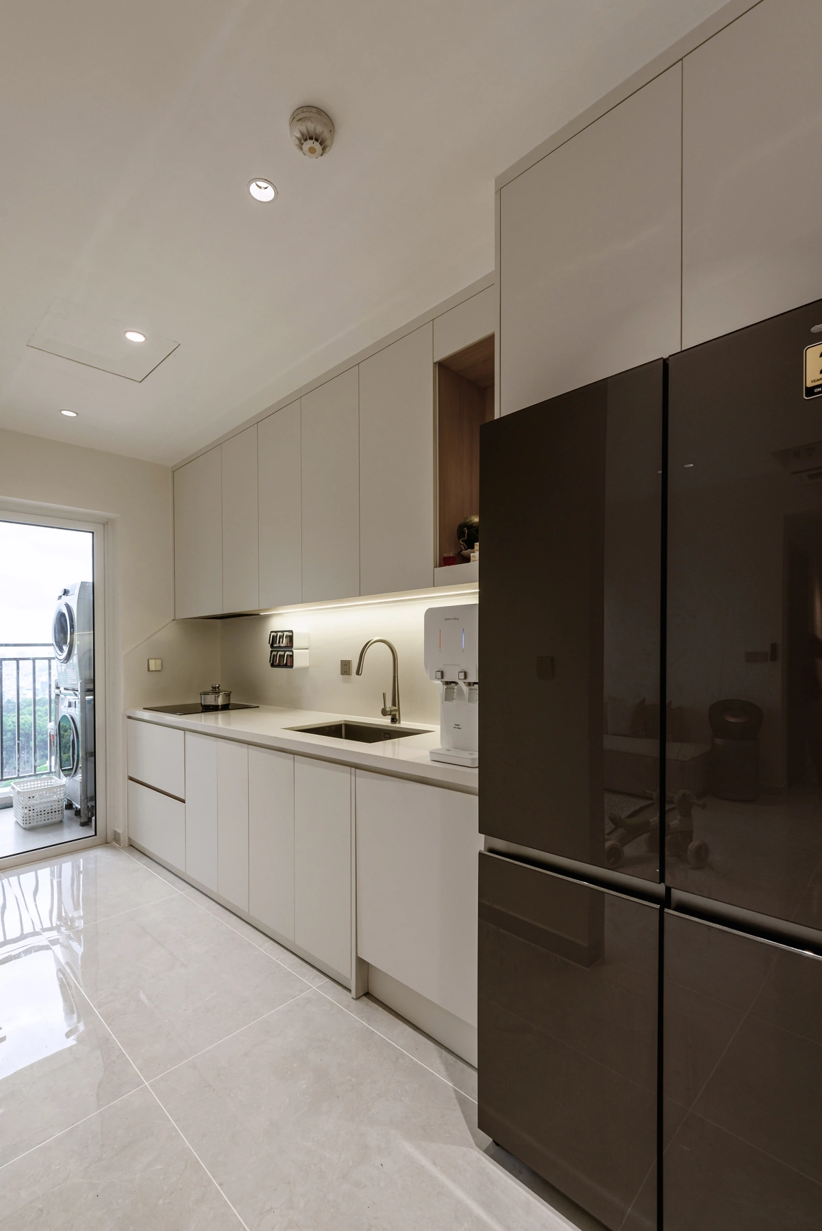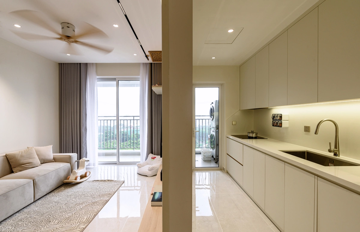 Không gian phòng bếp được tách biệt khỏi phòng khách và bàn ăn, đảm bảo sự riêng tư và tạo không gian chơi an toàn cho trẻ.