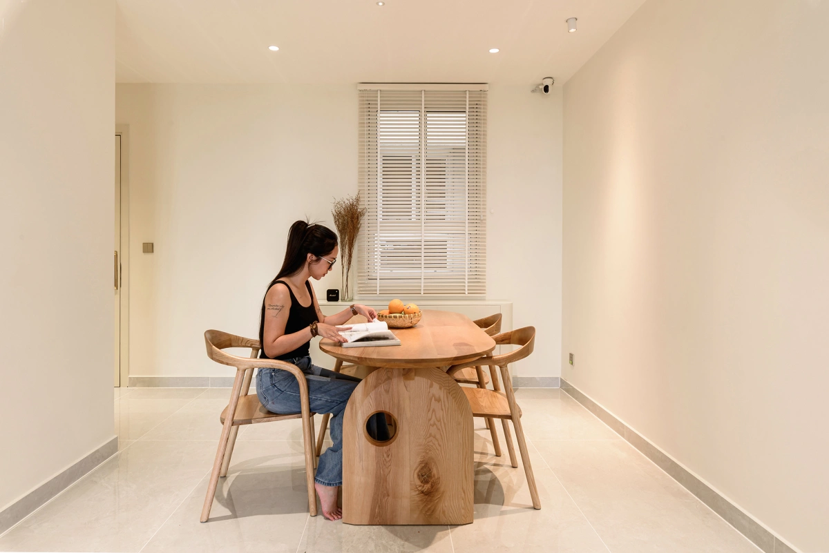 Màu sắc được lựa chọn là hệ trung tính, chủ đạo là màu trắng minimal và nâu gỗ tạo cảm giác thoải mái, ấm áp.