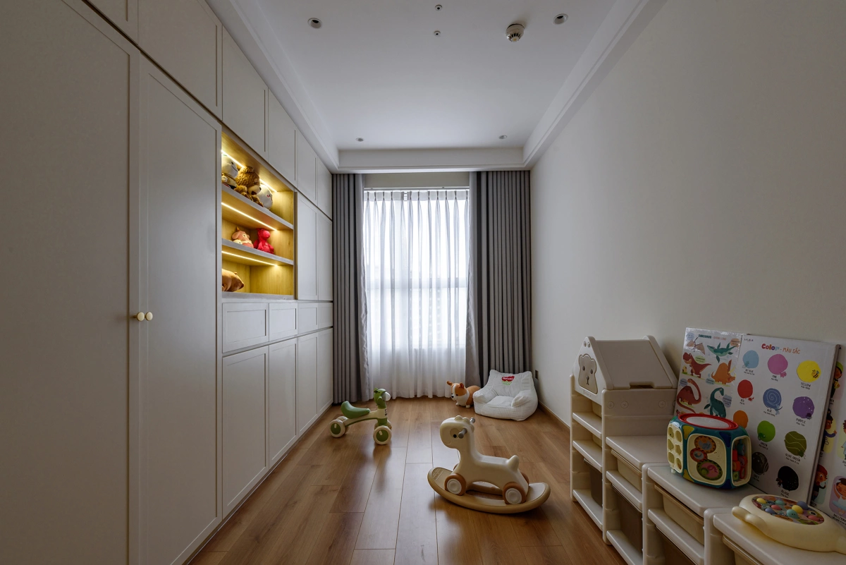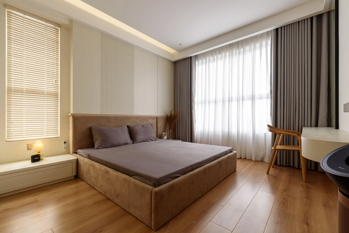 Phòng ngủ chính được thiết kế tối giản và an toàn với các chi tiết mềm mại, loại bỏ góc nhọn để bảo vệ trẻ nhỏ.
