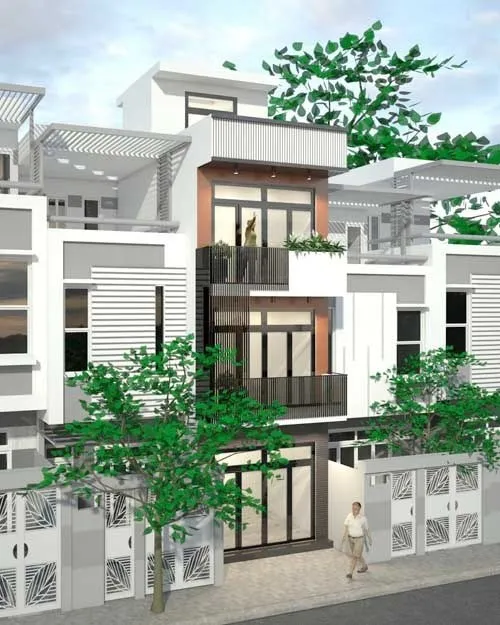 Mẫu nhà 3 tầng 1 tum dưới đây có những khối ban công đảm bảo cân bằng trong tổng thể. Đồng thời tạo được khoảng trống để đón sáng và gió thoáng cho không gian bên trong. Tầng tum được thiết kế hệ lam che cao ráo khiến mặt tiền trông sinh động, thu hút hơn.