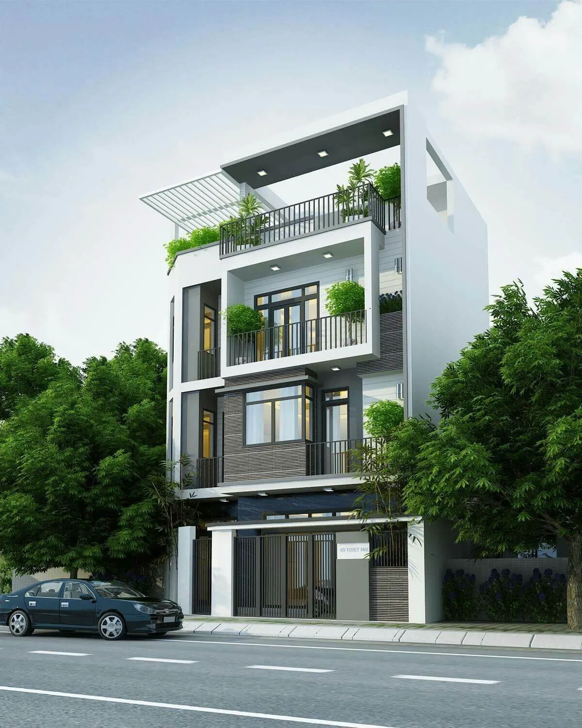 Mẫu nhà 3 tầng 1 tum hiện đại này được sở hữu các ban công rộng kết hợp với những chậu cây xanh tô điểm thêm cho mặt tiền ngôi nhà. Ở ngoại thất, kiến trúc sư sử dụng gạch đá hoa cương để làm không gian này sáng hơn, cũng như rộng hơn.