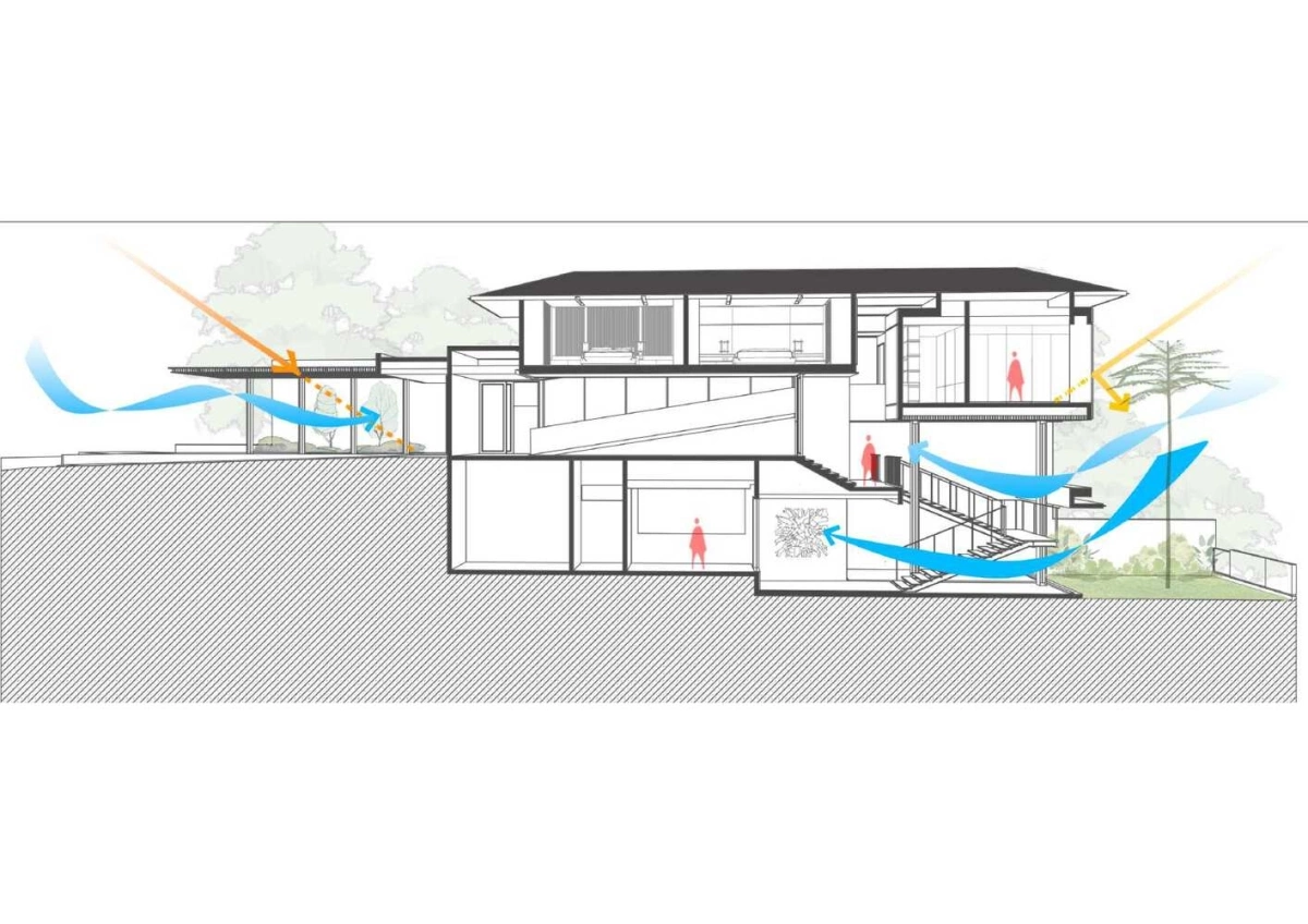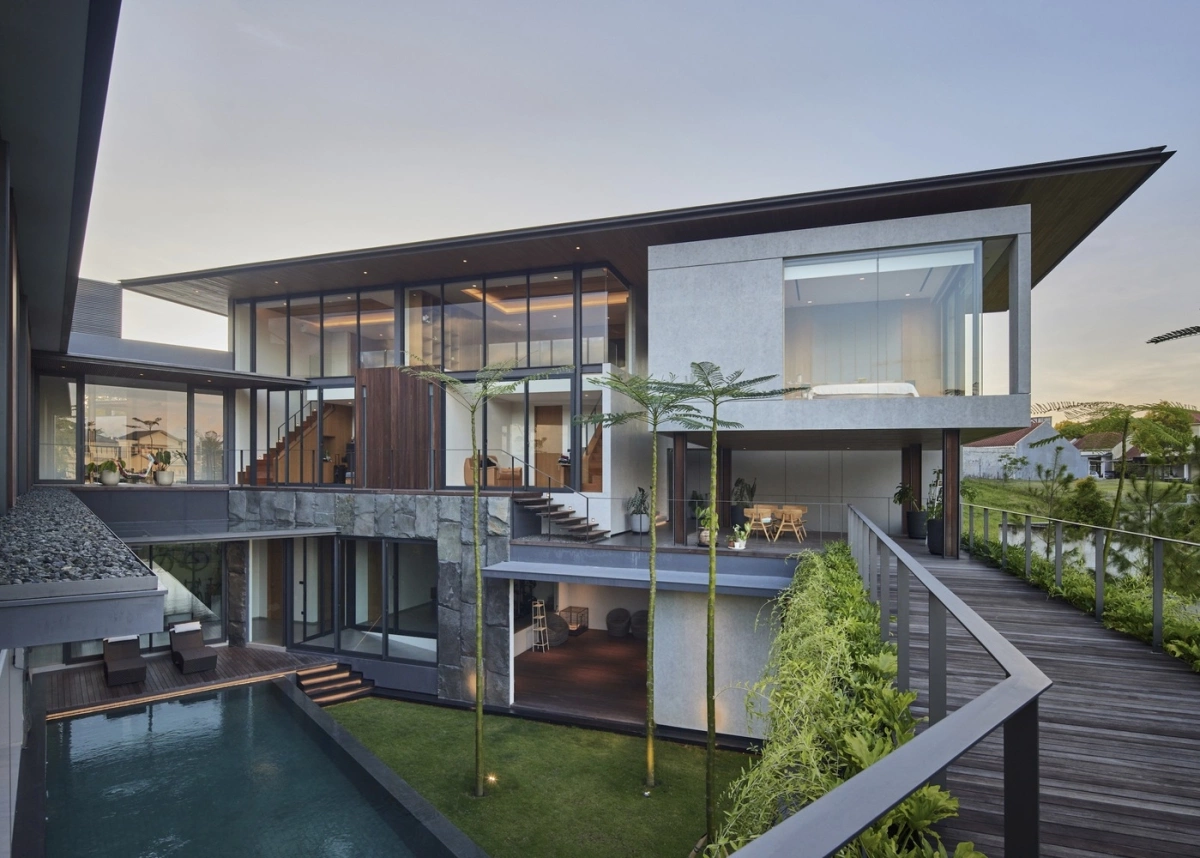 Ngôi nhà có quy mô 2 tầng và 1 tầng bán hầm, được xây dựng trên khu đất rộng 1200 m2. Công trình là sự kết hợp của các hộp bê tông xếp chồng lên nhau, với điểm nhấn là chi tiết ốp gỗ và đá tự nhiên. Kiến trúc này cũng giúp tối đa hóa ánh sáng tự nhiên và thông gió, tạo ra nhiều không gian riêng tư và tầm nhìn mở rộng ở nhiều cấp độ khác nhau.