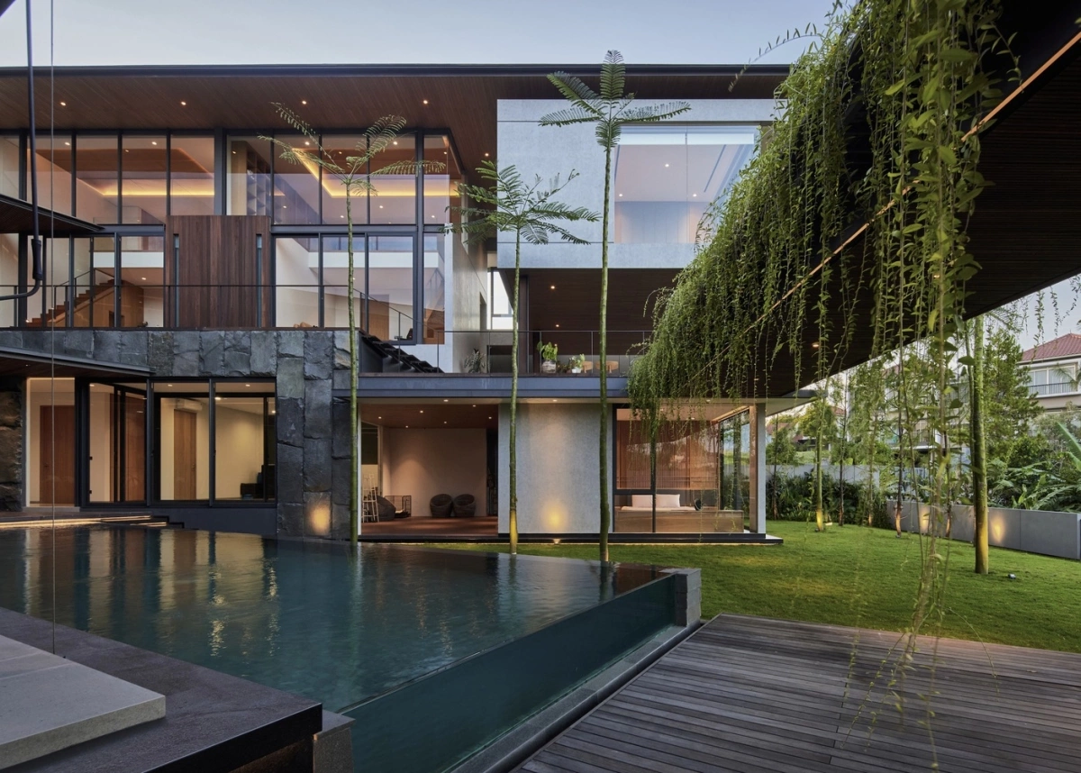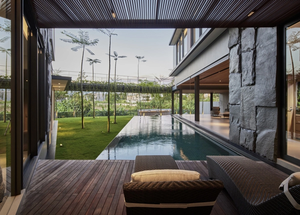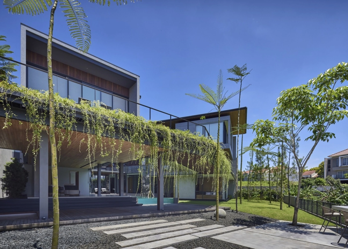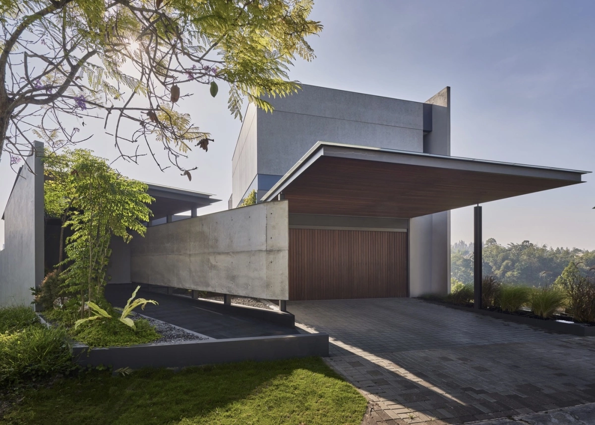 Sự kết hợp của các vật liệu tạo nên sự tương phản thị giác ấn tượng, nâng cao tính thẩm mỹ hiện đại của ngôi nhà, đồng thời tạo cảm giác hài hòa với bối cảnh nhiệt đới.