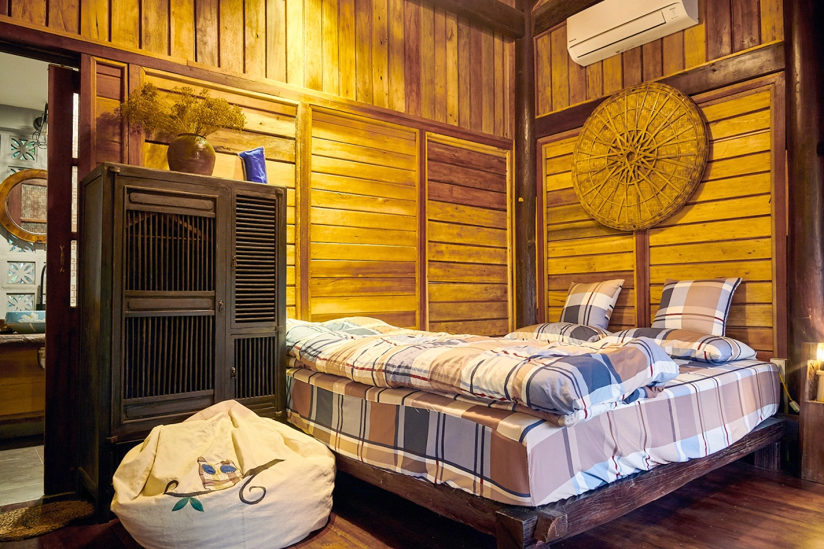 Căn nhà nào cũng có thiết kế không gian mở, đầy đủ công năng hiện đại với phòng ngủ, khu vực uống trà, nhà vệ sinh riêng biệt. Nội thất bên trong hoàn toàn bằng gỗ tái chế từ đồ cũ, sưu tầm từ các căn nhà cổ ở miền Bắc.