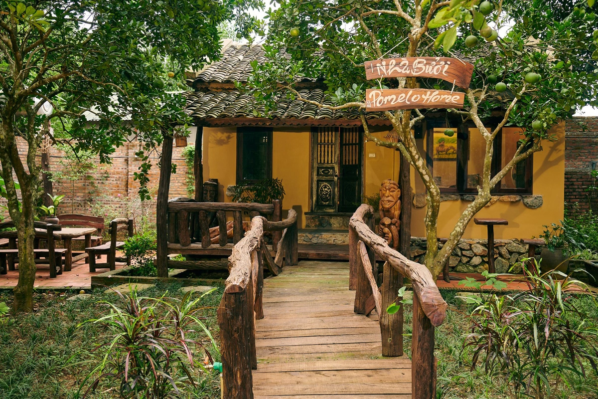 Lối vào nhà Bưởi băng qua một cây cầu gỗ. Giống nhà Mít, nhà Xoài,… Mái nhà Bưởi được lợp ngói âm dương đặt mua từ Hà Giang. Mùa hè, nhiệt độ trong nhà thấp hơn ngoài trời khá nhiều.