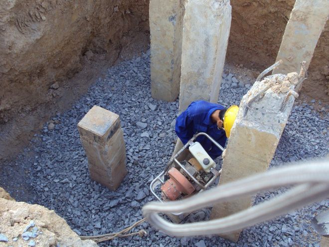 Công tác đầm đá 4×6 trước khi đổ bê tông lót trong thi công móng cọc.