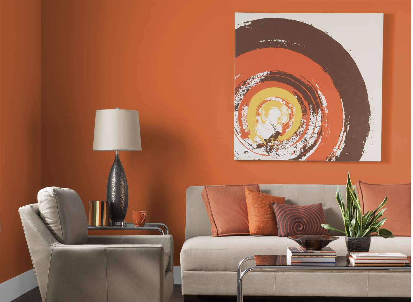 Phòng khách được coi là nơi dễ áp dụng gam màu tối nhất. Bạn có thể phủ màu cam sặc sỡ lên toàn bộ tường hoặc các phụ kiện như gối tựa lưng, tranh vẽ,…