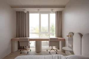 Thiết kế căn nhà thể hiện sự tiết chế, sử dụng tông màu trung tính,...