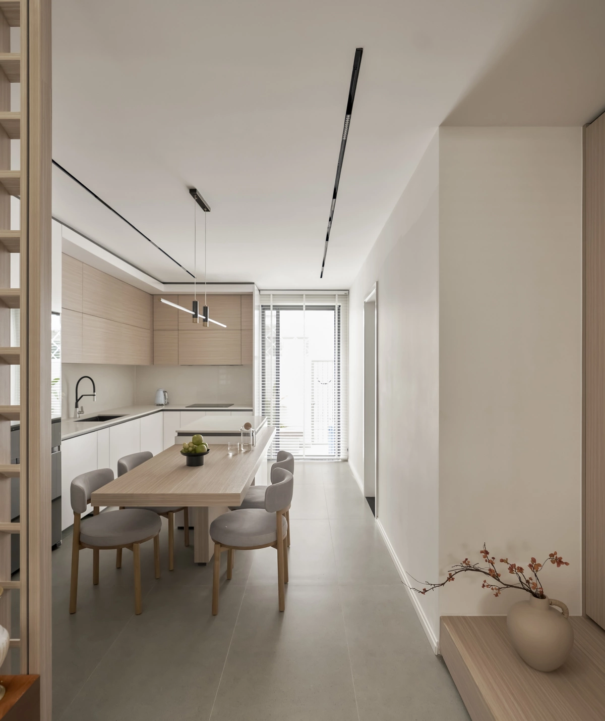 Phòng bếp – ăn luôn ngập tràn ánh sáng tự nhiên nhờ nằm sát sân sau, liền kề khoảng thông tầng kiêm giếng trời.