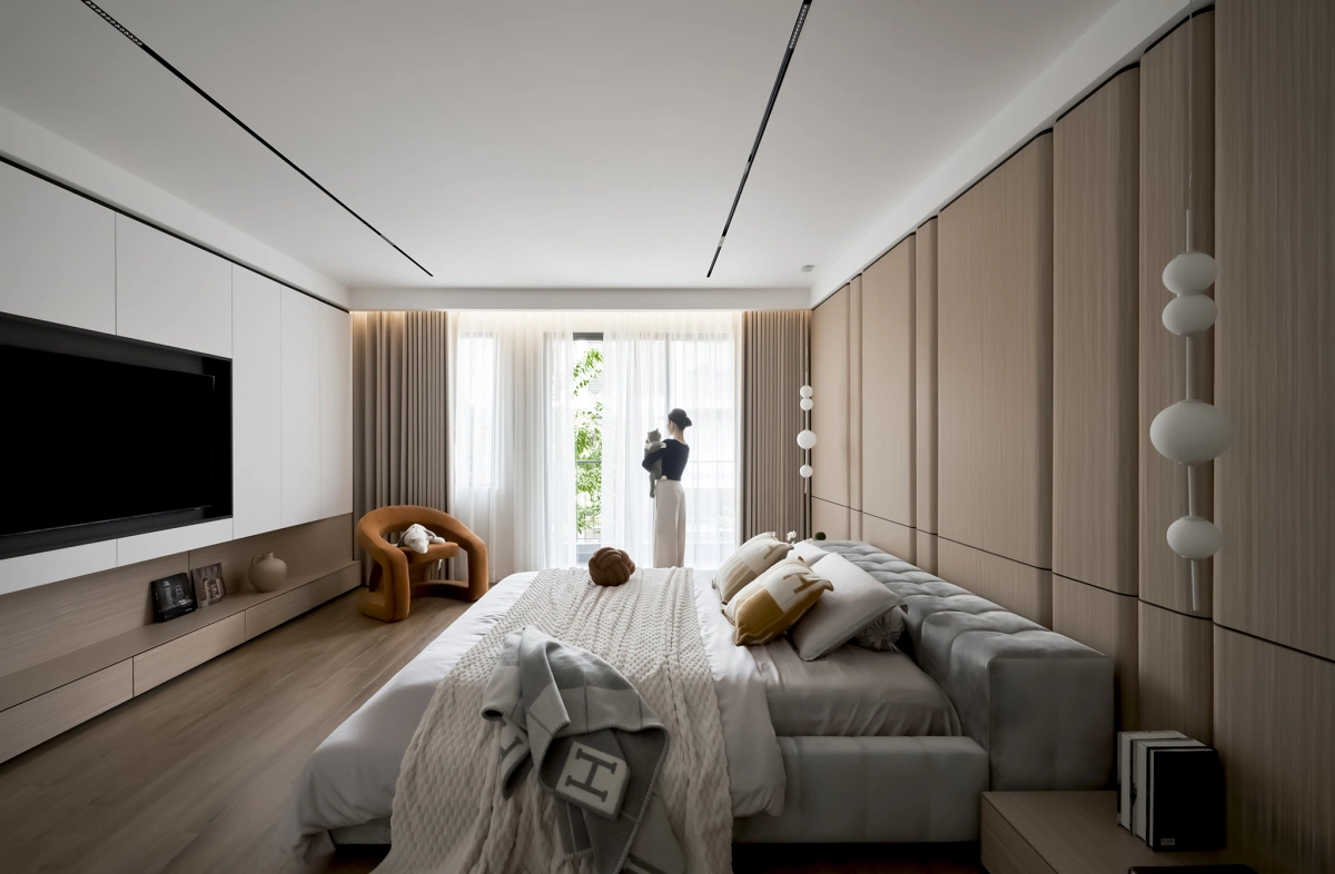 Phòng ngủ chính với nội thất tối giản, chú trọng giải pháp lấy sáng và thông gió tự nhiên.